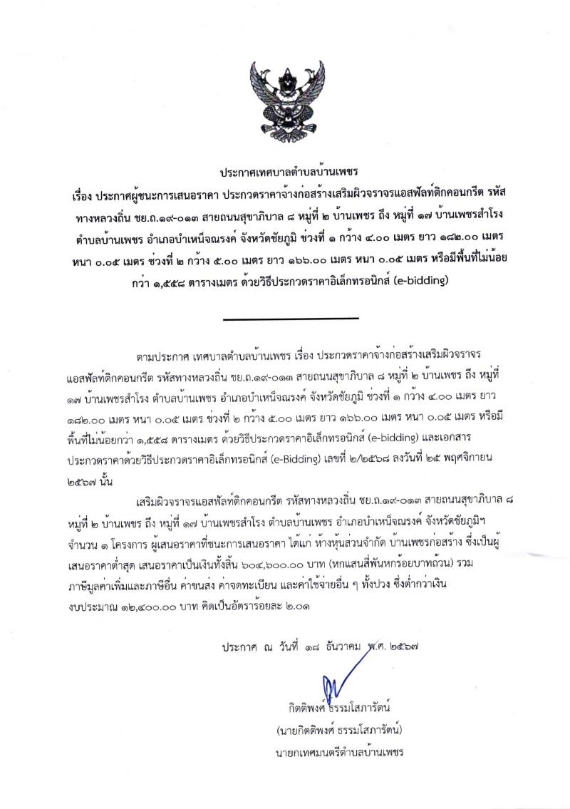 ปรับปรุงถนนเสริมผิวจราจรแอสฟัลท์ติกคอนกรีต รหัสทางหลวงถิ่น ชย.ถ.19-013 สายถนนสุขาภิบาล 8 หมู่ที่ 2 บ้านเพชร ถึง หมู่ที่ 17 บ้านเพชรสําโรง