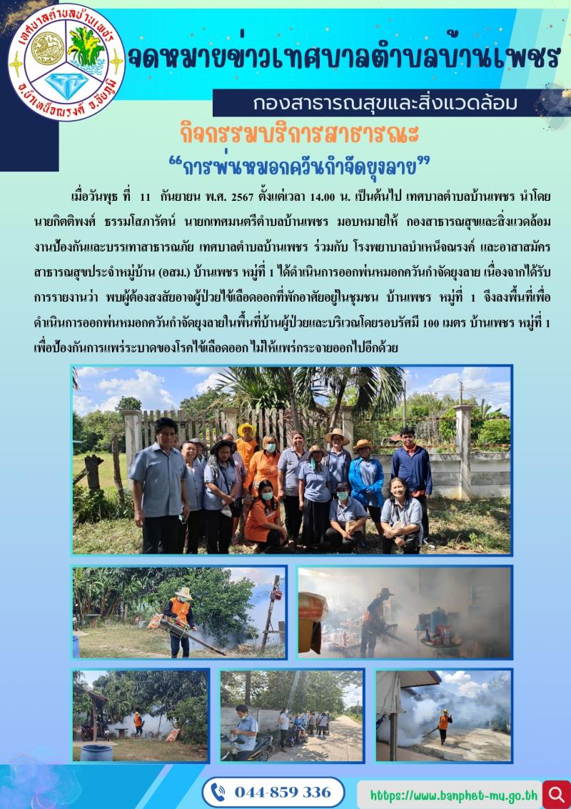 เมื่อวันพุธ ที่ 11 กันยายน พ.ศ. 2567 ตั้งแต่เวลา 14.00 น. เป็นต้นไป เทศบาลตำบลบ้านเพชร นำโดย นายกิตติพงศ์ ธรรมโสภารัตน์ นายกเทศมนตรีตำบลบ้านเพชร มอบหมายให้ กองสาธารณสุขและสิ่งแวดล้อม งานป้องกันและบรรเทาสาธารณภัย เทศบาลตำบลบ้านเพชร ร่วมกับ โรงพยาบาลบำเหน็จณรงค์ และอาสาสมัครสาธารณสุขประจำหมู่บ้าน (อสม.) บ้านเพชร หมู่ที่ 1 ได้ดำเนินการออกพ่นหมอกควันกำจัดยุงลาย เนื่องจากได้รับการรายงานว่า พบผู้ต้องสงสัยอาจผู้ป่วยไข้เลือดออกที่พักอาศัยอยู่ในชุมชน บ้านเพชร หมู่ที่ 1 จึงลงพื้นที่เพื่อดำเนินการออกพ่นหมอกควันกำจัดยุงลายในพื้นที่บ้านผู้ป่วยและบริเวณโดยรอบรัศมี 100 เมตร บ้านเพชร หมู่ที่ 1 เพื่อป้องกันการแพร่ระบาดของโรคไข้เลือดออก ไม่ให้แพร่กระจายออกไปอีกด้วย
