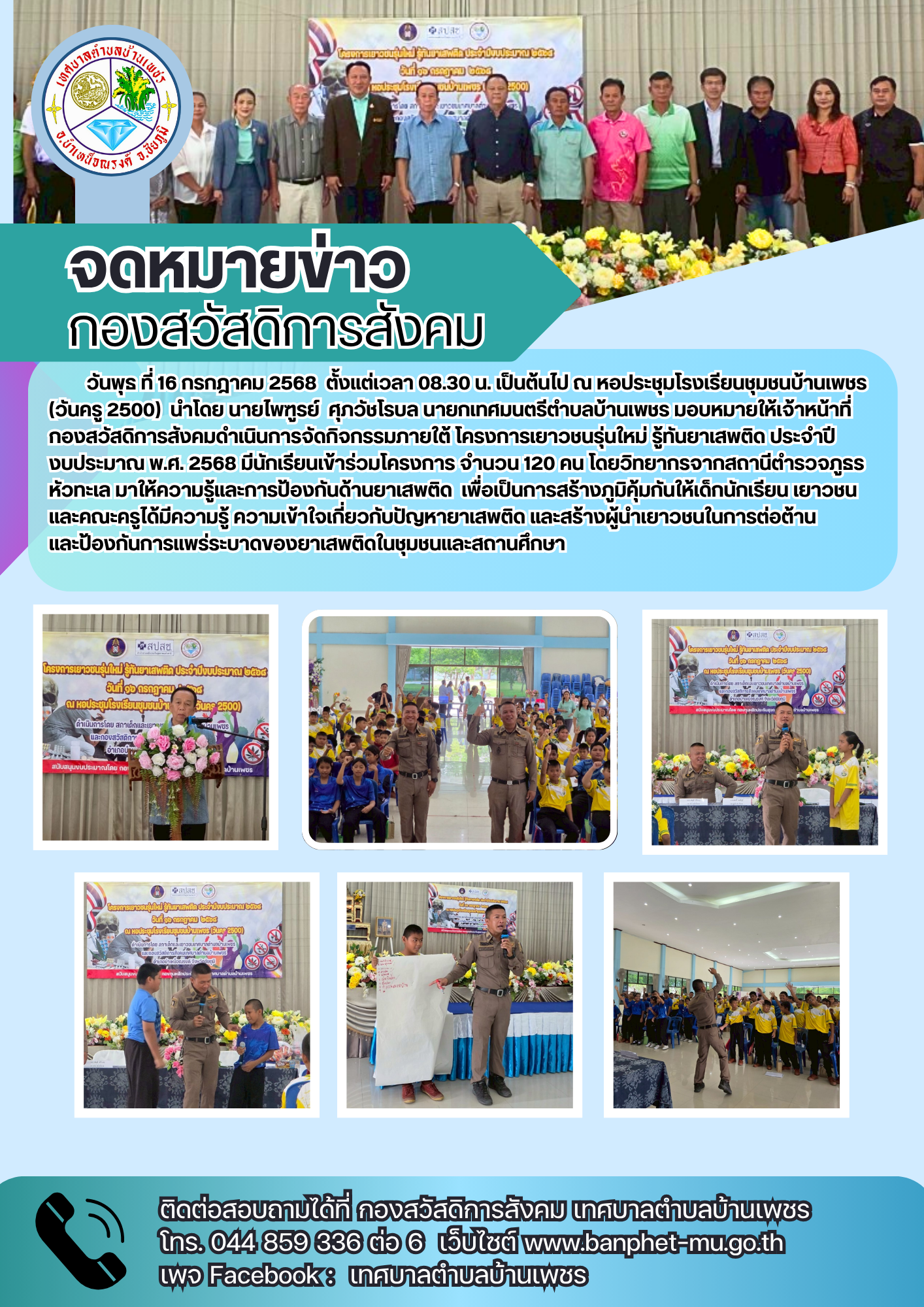 รายละเอียด : วันพุธ ที่ 16 กรกฎาคม 2568 ตั้งแต่เวลา 08.30 น. เป็นต้นไป ณ หอประชุมโรงเรียนชุมชนบ้านเพชร