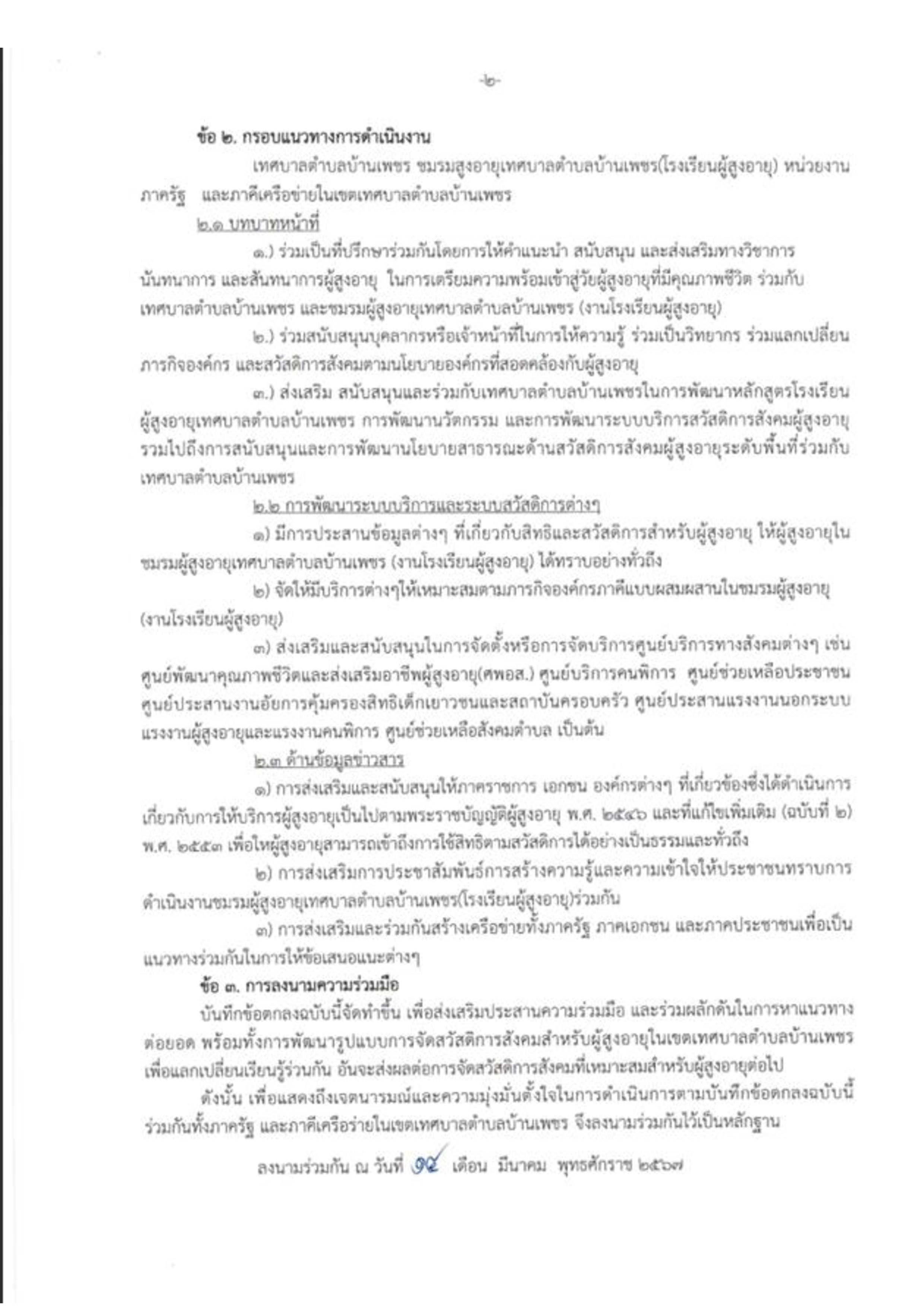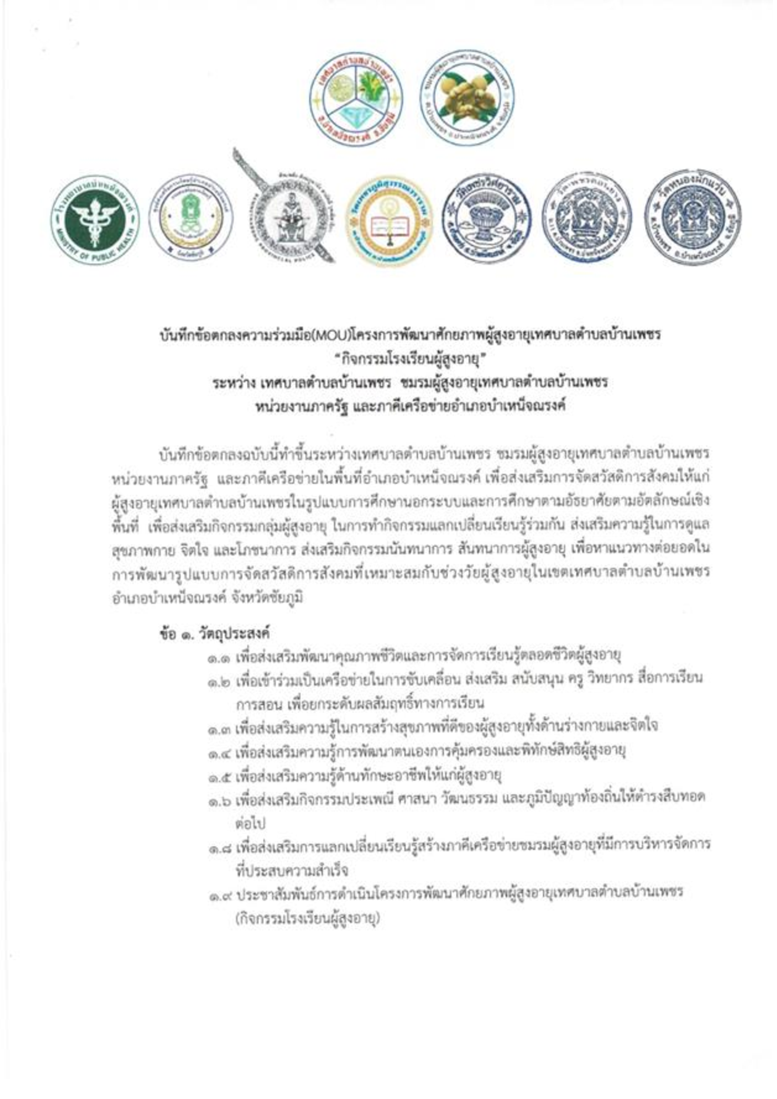 พิธีลงนามบันทึกข้อตกลงความร่วมมือ (MOU) ขับเคลื่อนโครงการพัฒนา ศักยภาพผู้สูงอายุเทศบาลตำบลบ้านเพชร (กิจกรรมโรงเรียนผู้สูงอายุ) ประจำปีงบประมาณ พ.ศ. ๒๕๖๗