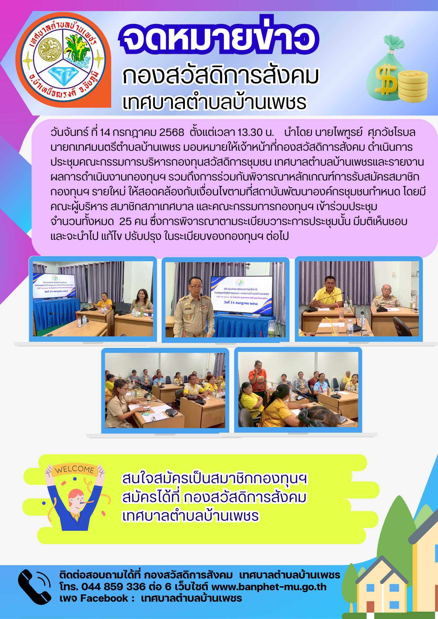 รายละเอียด : วันจันทร์ ที่ 14 กรกฎาคม 2568 ตั้งแต่เวลา 13.30 น. นำโดย นายไพฑูรย์ ศุภวัชโรบล นายกเทศมนตรีตำบลบ้านเพชร มอบหมายให้เจ้าหน้าที่กองสวัสดิการสังคม ดำเนินการประชุมคณะกรรมการบริหารกองทุนสวัสดิการชุมชน เทศบาลตำบลบ้านเพชรและรายงานผลการดำเนินงานกองทุนฯ รวมถึงการร่วมกันพิจารณาหลักเกณฑ์การรับสมัครสมาชิกกองทุนฯ รายใหม่ ให้สอดคล้องกัเงื่อนไขตามที่สถาบันพัฒนาองค์กรชุมชนกำหนด โดยมีคณะผู้บริหาร สมาชิกสภาเทศบาล และคณะกรรมการกองทุนฯ เข้าร่วมประชุมจำนวนทั้งหมด 25 คน ซึ่งการพิจารณาตามระเบียบวาระการประชุมนั้น มีมติเห็นชอบและจะนำไป แก้ไข ปรับปรุง ในระเบียบของกองทุนฯ ต่อไป