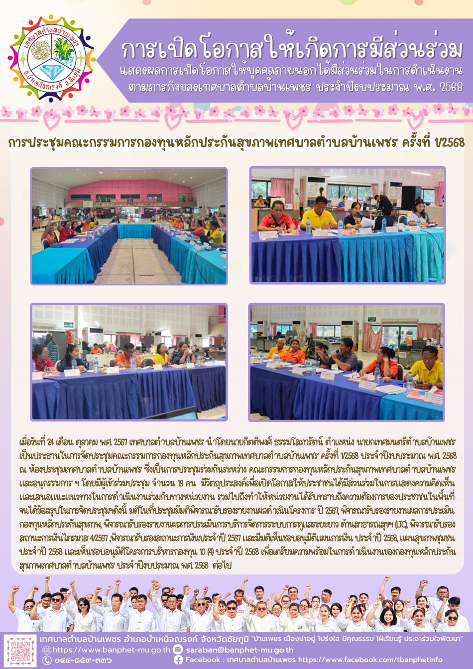 การประชุมคณะกรรมการกองทุนหลักประกันสุขภาพเทศบาลตำบลบ้านเพชร ครั้งที่ 1/2568 [24 ตุลาคม 2567]