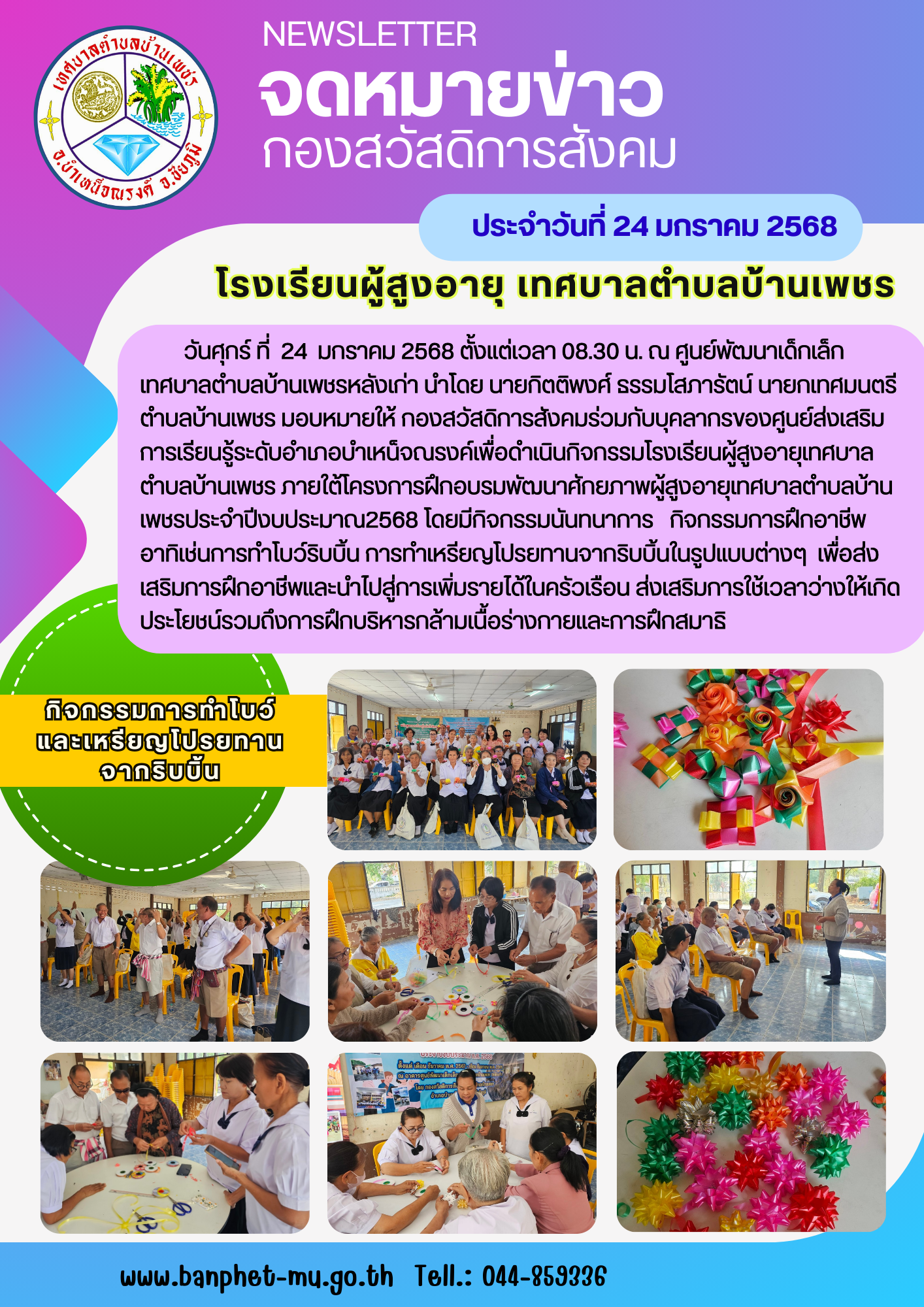 รายละเอียด : วันศุกร์ ที่ 24 มกราคม 2568 ตั้งแต่เวลา 08.30 น. ณ ศูนย์พัฒนาเด็กเล็กเทศบาลตำบลบ้านเพชรหลังเก่า นำโดย นายกิตติพงศ์ ธรรมโสภารัตน์ นายกเทศมนตรีตำบลบ้านเพชร มอบหมายให้ กองสวัสดิการสังคมร่วมกับบุคลากรของศูนย์ส่งเสริมการเรียนรู้ระดับอำเภอบำเหน็จณรงค์เพื่อดำเนินกิจกรรมโรงเรียนผู้สูงอายุเทศบาลตำบลบ้านเพชร ภายใต้โครงการฝึกอบรมพัฒนาศักยภาพผู้สูงอายุเทศบาลตำบลบ้านเพชรประจำปีงบประมาณ2568 โดยมีกิจกรรมนันทนาการ กิจกรรมการฝึกอาชีพ อาทิเช่นการทำโบว์ริบบิ้น การทำเหรียญโปรยทานจากริบบิ้นในรูปแบบต่างๆ เพื่อส่งเสริมการฝึกอาชีีพและนำไปสู่การเพิ่มรายได้ในครัวเรือน ส่งเสริมการใช้เวลาว่างให้เกิดประโยชน์รวมถึงการฝึกบริหารกล้ามเนื้อร่างกายและการฝึกสมาธิ