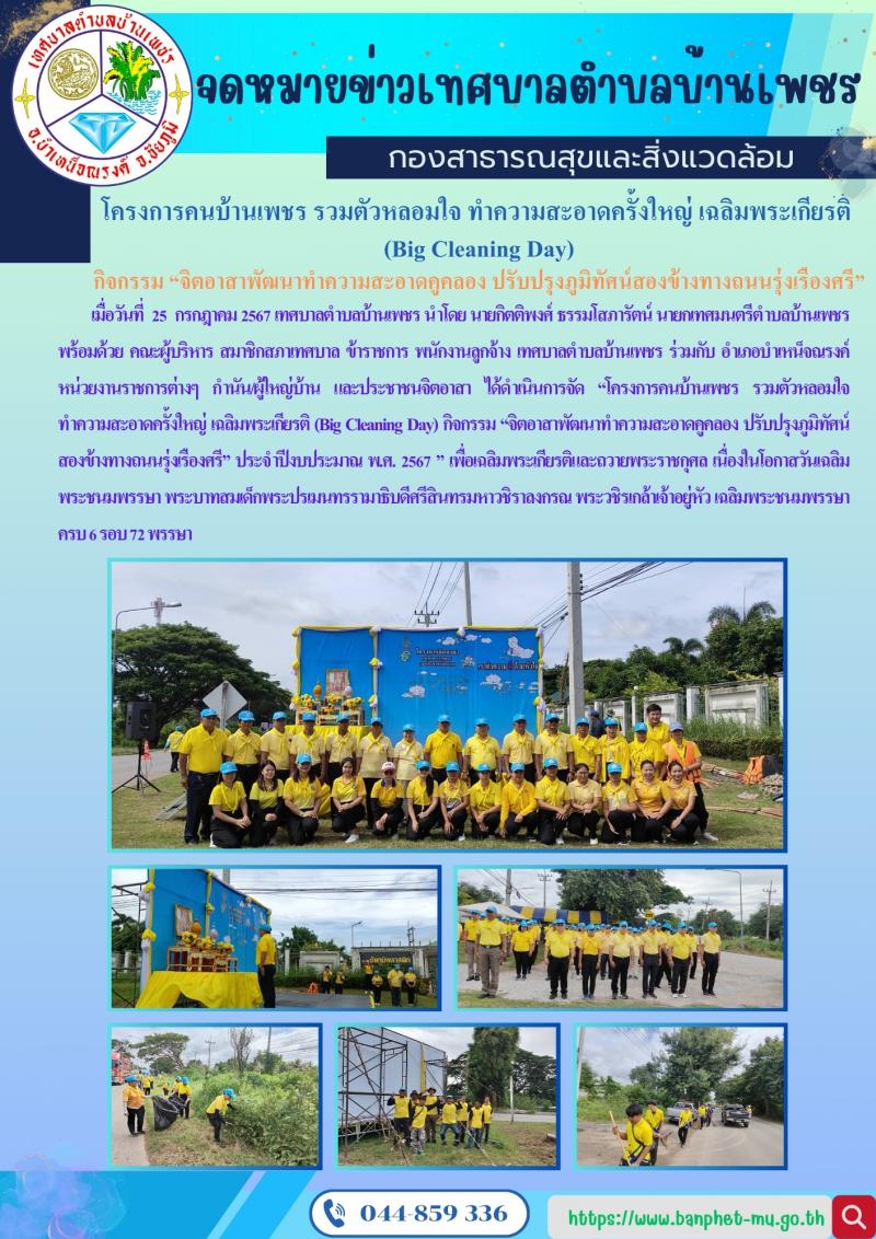 เมื่อวันที่ 25 กรกฎาคม 2567 เทศบาลตำบลบ้านเพชร นำโดย นายกิตติพงศ์ ธรรมโสภารัตน์ นายกเทศมนตรีตำบลบ้านเพชร พร้อมด้วย คณะผู้บริหาร สมาชิกสภาเทศบาล ข้าราชการ พนักงาน พนักงานจ้าง และลูกจ้างเทศบาลตำบลบ้านเพชร ร่วมกับ อำเภอบำเหน็จณรงค์ หน่วยงานราชการต่างๆ กำนัน/ผู้ใหญ่บ้าน และประชาชนจิตอาสา ได้ดำเนินการจัด “โครงการคนบ้านเพชร รวมตัวหลอมใจ ทำความสะอาดครั้งใหญ่ เฉลิมพระเกียรติ (Big Cleaning Day) กิจกรรม “จิตอาสาพัฒนาทำความสะอาดคูคลอง ปรับปรุงภูมิทัศน์สองข้างทางถนนรุ่งเรืองศรี” ประจำปีงบประมาณ พ.ศ. 2567 ” เพื่อเฉลิมพระเกียรติและถวายพระราชกุศล เนื่องในโอกาสวันเฉลิมพระชนมพรรษา พระบาทสมเด็กพระปรเมนทรรามาธิบดีศรีสินทรมหาวชิราลงกรณ พระวชิรเกล้าเจ้าอยู่หัว เฉลิมพระชนมพรรษาครบ 6 รอบ 72 พรรษาโดยมีนายประพันธ์ สู่หนองบัว นายอำเภอบำเหน็จณรงค์ เป็นประธานในพิธี ทั้งนี้เหล่าพสกนิการและมวลชนจิตอาสาทุกหมู่เหล่าต่างปิติยินดีอย่างยิ่งที่ในโอกาสดีๆ มหามงคลอย่างนี้ได้ทำความดีร่วมกันและถวายเป็นพระราชกุศลอีกด้วย