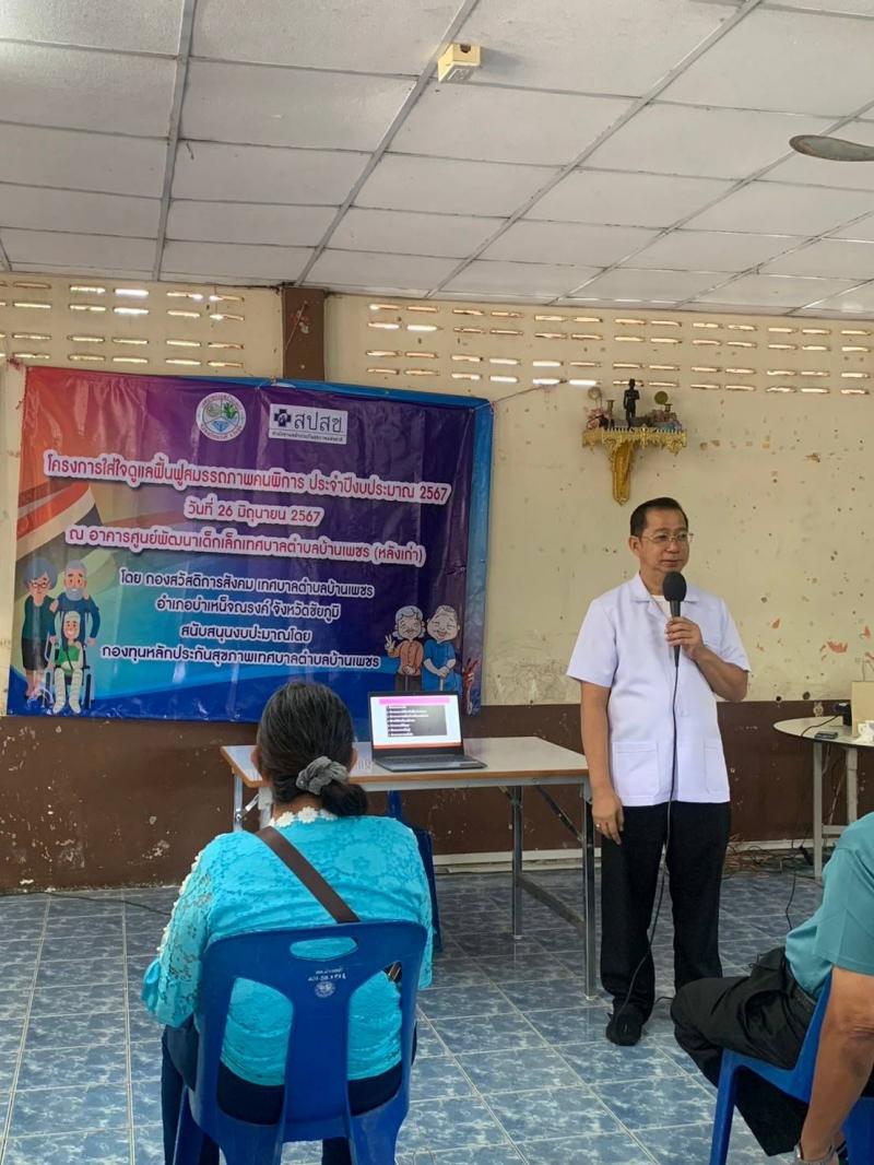 รายละเอียด : โครงการใส่ใจดูแลฟื้นฟูสมรรถภาพคนพิการ ---------------------------------------------------- วันที่ 26 มิถุนายน 2567 เวลา 09.00 น. เป็นต้นไป เทศบาลตำบลบ้านเพชร นำโดย นายกิตติพงศ์ ธรรมโสภารัตน์ นายกเทศมนตรีตำบลบ้านเพชร มอบหมายให้ กองสวัสดิการสังคม ร่วมกับ อาสาสมัครบริบาลท้องถิ่นและ โรงพยาบาลบำเหน็จณรงค์ จัดทำโครงการใส่ใจดูแลฟื้นฟูสมรรถภาพคนพิการ โดยมีทีมวิทยากร จาก โรงพยาบาลบำเหน็จณรงค์ มาให้ความรู้เกี่ยวกับการดูผู้พิการ สร้างความเข้าใจในผู้พิการและตระหนักรู้ถึงขั้นตอนวิธีการที่จะช่วยเหลือดูแลผู้พิการ ซึ่งมีผู้เข้าร่วมอบรมประกอบด้วย อาสาสมัครบริบาลท้องถิ่น, ผู้พิการ, ผู้ดูแลคนพิการและ อสม.จำนวน 40 คนเข้าร่วมอบรมในครั้งนี้