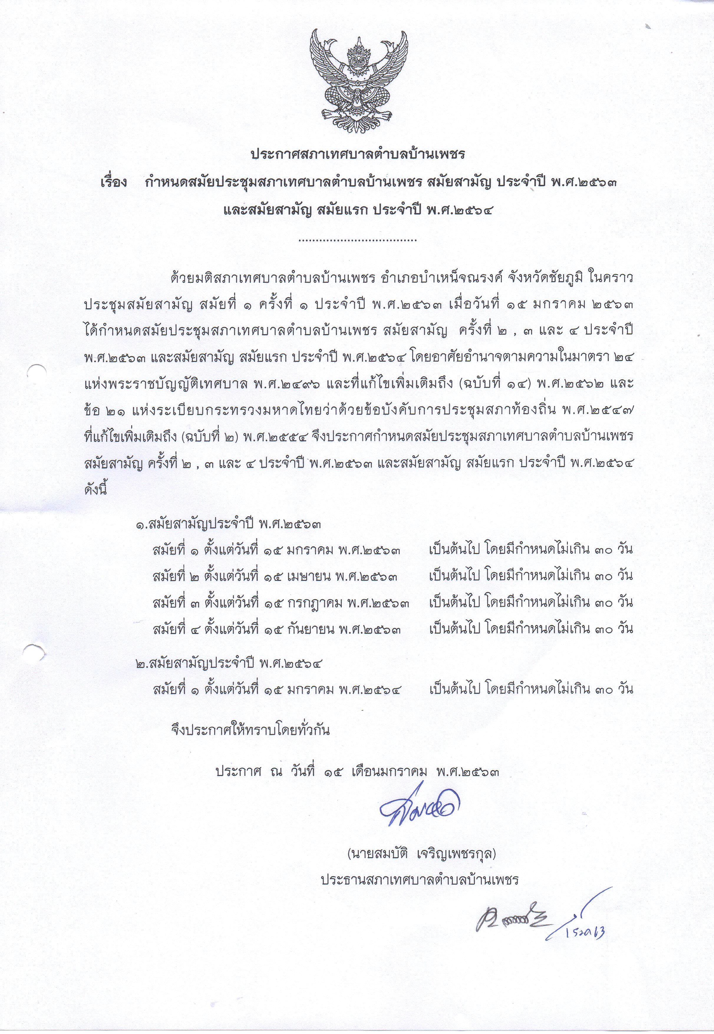 กำหนดสมัยประชุมสภาเทศบาลตำบลบ้านเพชรสมัยสามัญ ประจำปี2563 และสมัยสามัญ สมัยแรก ประจำปี2564