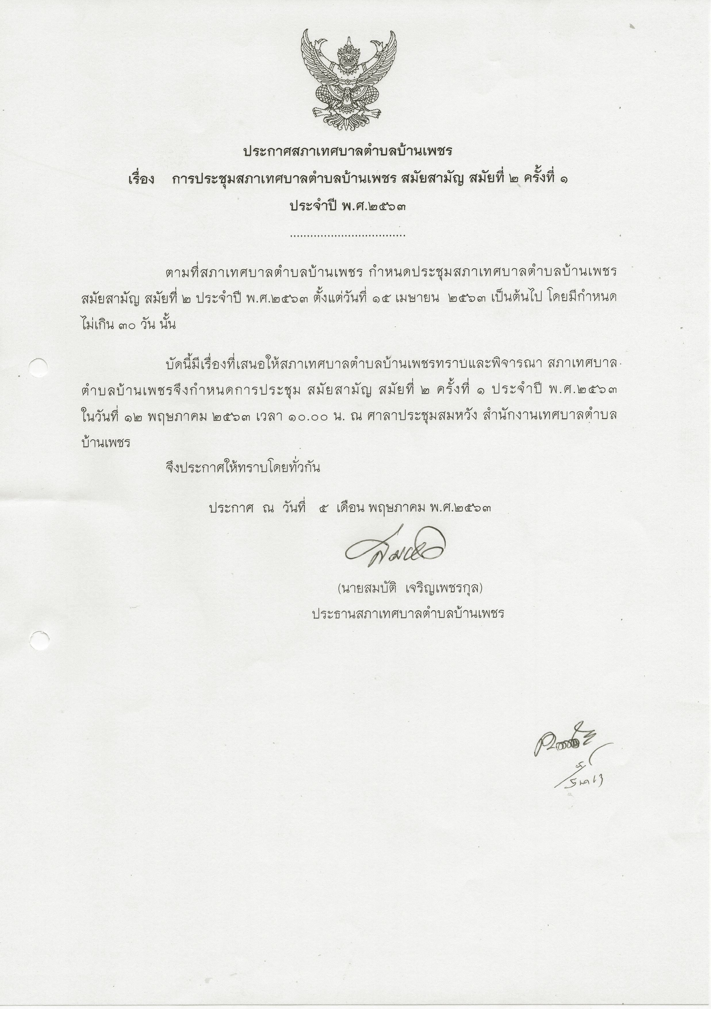 การประชุมสภาเทศบาลตำบลบ้านเพชรสมัยสามัญ สมัยที่ 2 ครั้งที่ 1 ประจำปีพ.ศ.2563