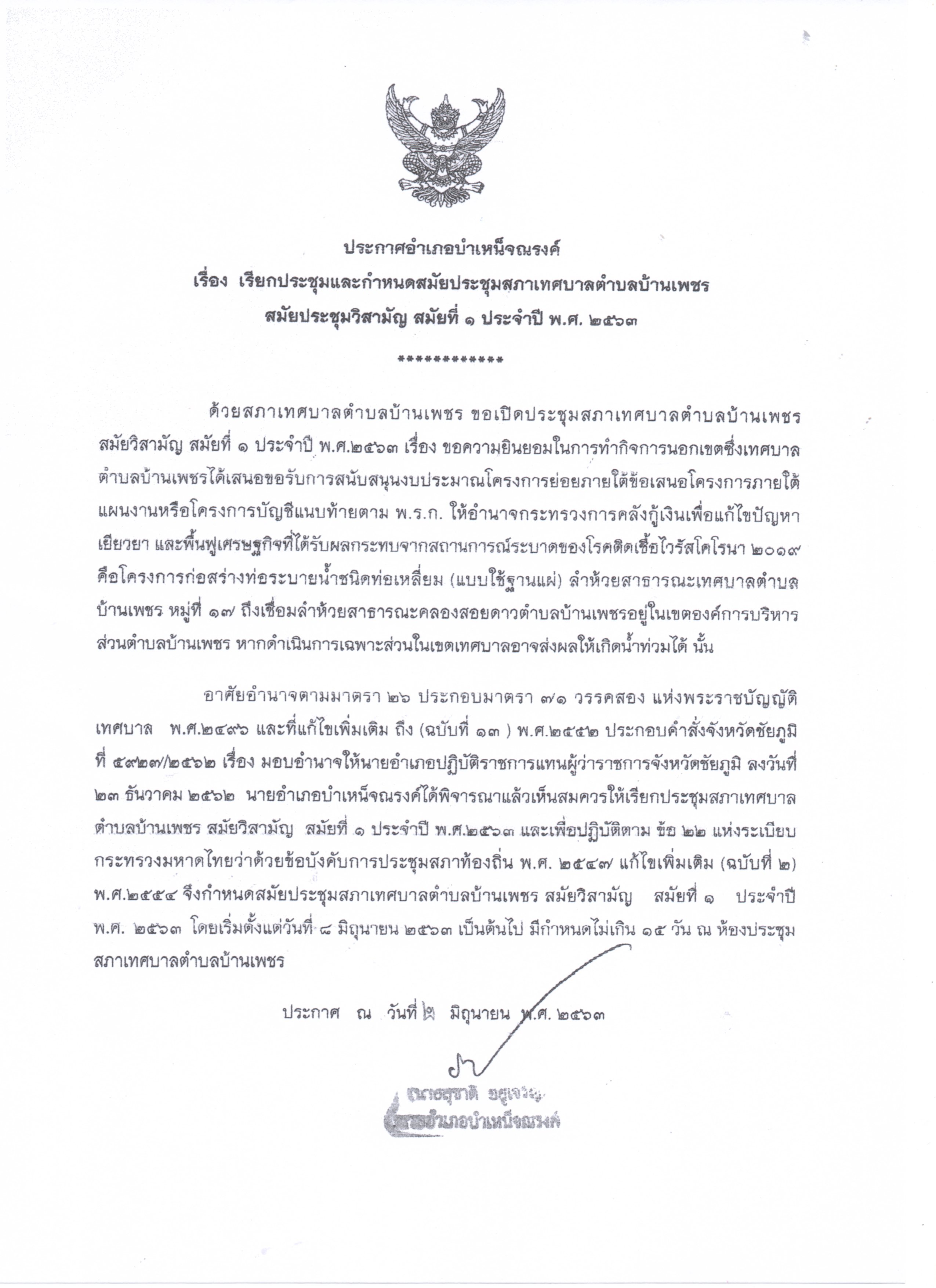 เรียกประชุมสภาสมัยวิสามัญ สมัยที่ 1 ประจำปีพ.ศ.2563