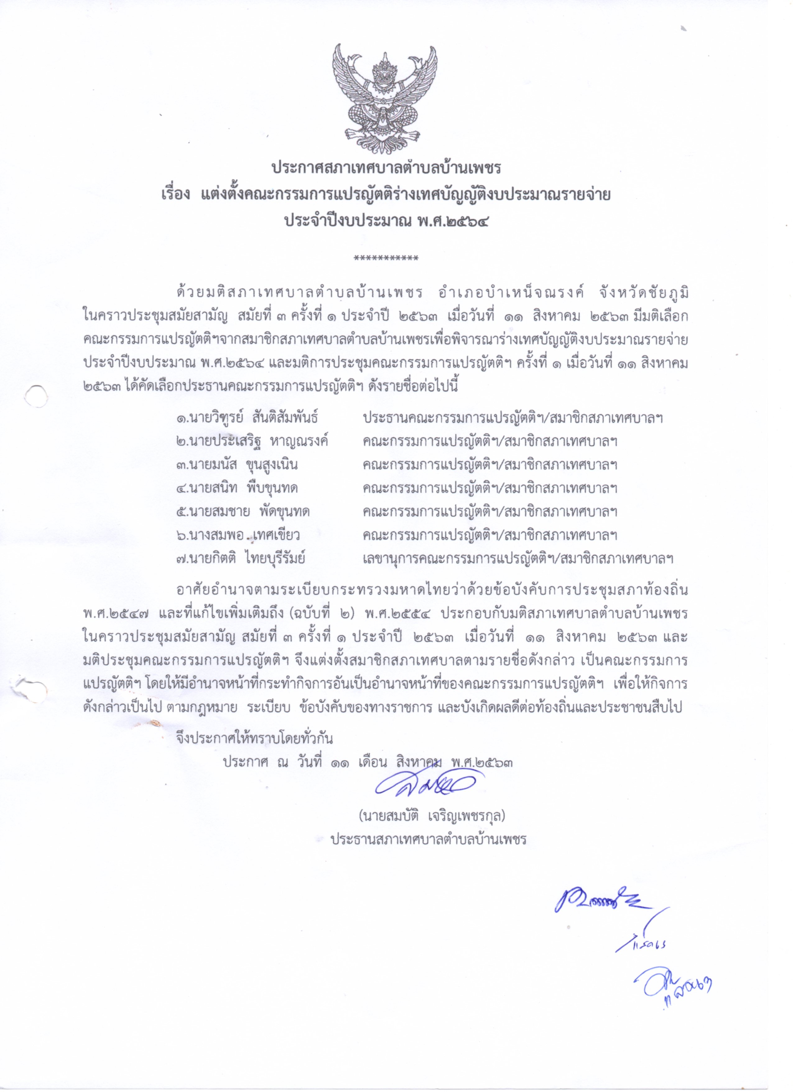 แต่งตั้งคณะกรรมการแปรญัตติร่างเทศบัญญัติงบประมาณรายจ่ายประจำปีงบประมาณพ.ศ.2564