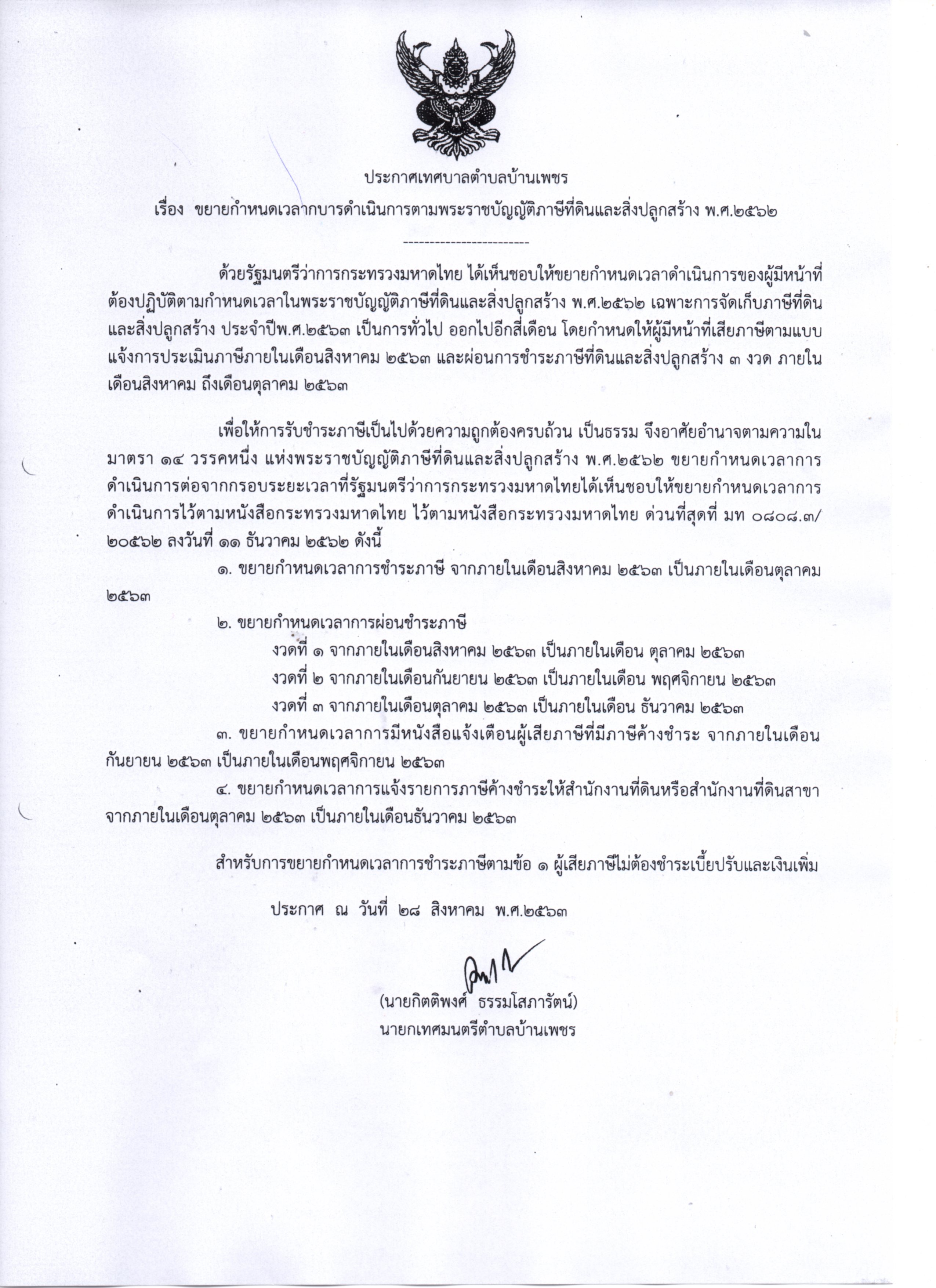 ประกาศเทศบาลตำบลบ้านเพชร เรื่อง ขยายกำหนดเวลาการดำเนินการตามพระราชบัญญัติภาษีที่ดินและสิ่งปลูกสร้างพ.ศ.2562