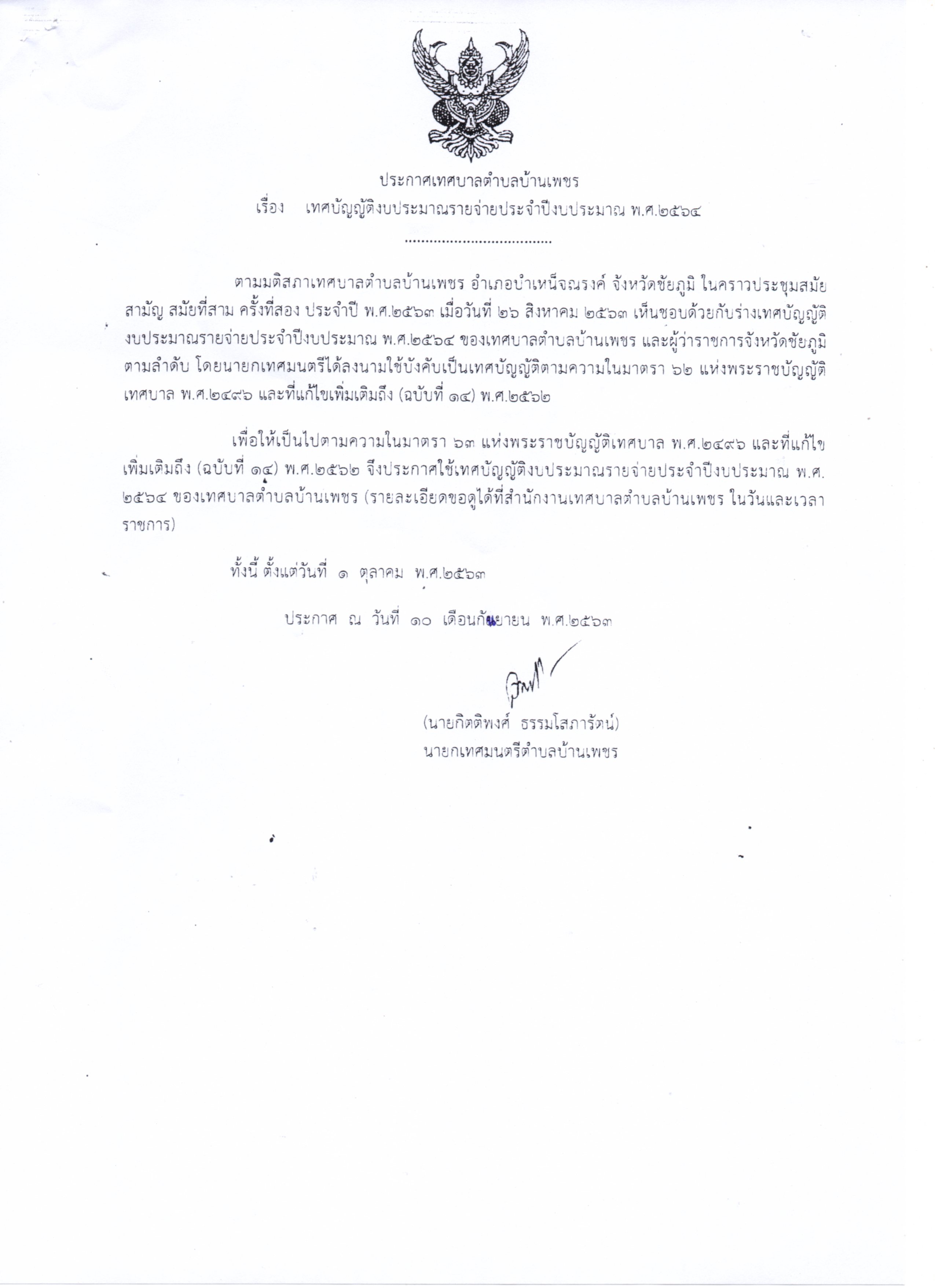 ประกาศเทศบาลตำบลบ้านเพชร เรื่อง เทศบัญญัติงบประมาณรายจ่ายประจำปีงบประมาณ พ.ศ.2564