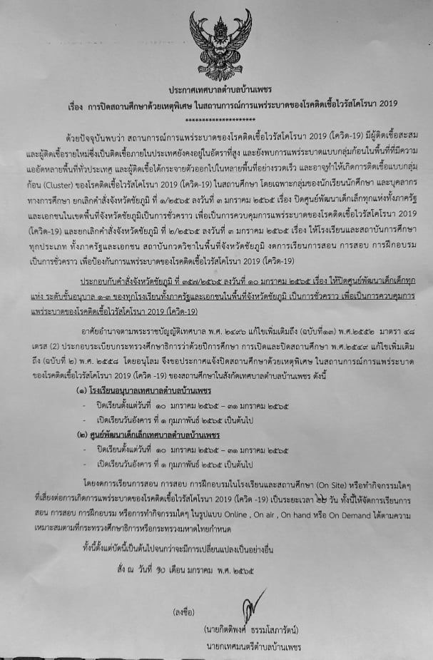 ประกาศเทศบาลตำบลบ้านเพชร เรื่อง การปิดสถานศึกษาด้วยเหตุพิเศษ ในสถานการณ์การแพร่ระบาดของโรคติดเชื้อไวรัชโคโรน่า 2019