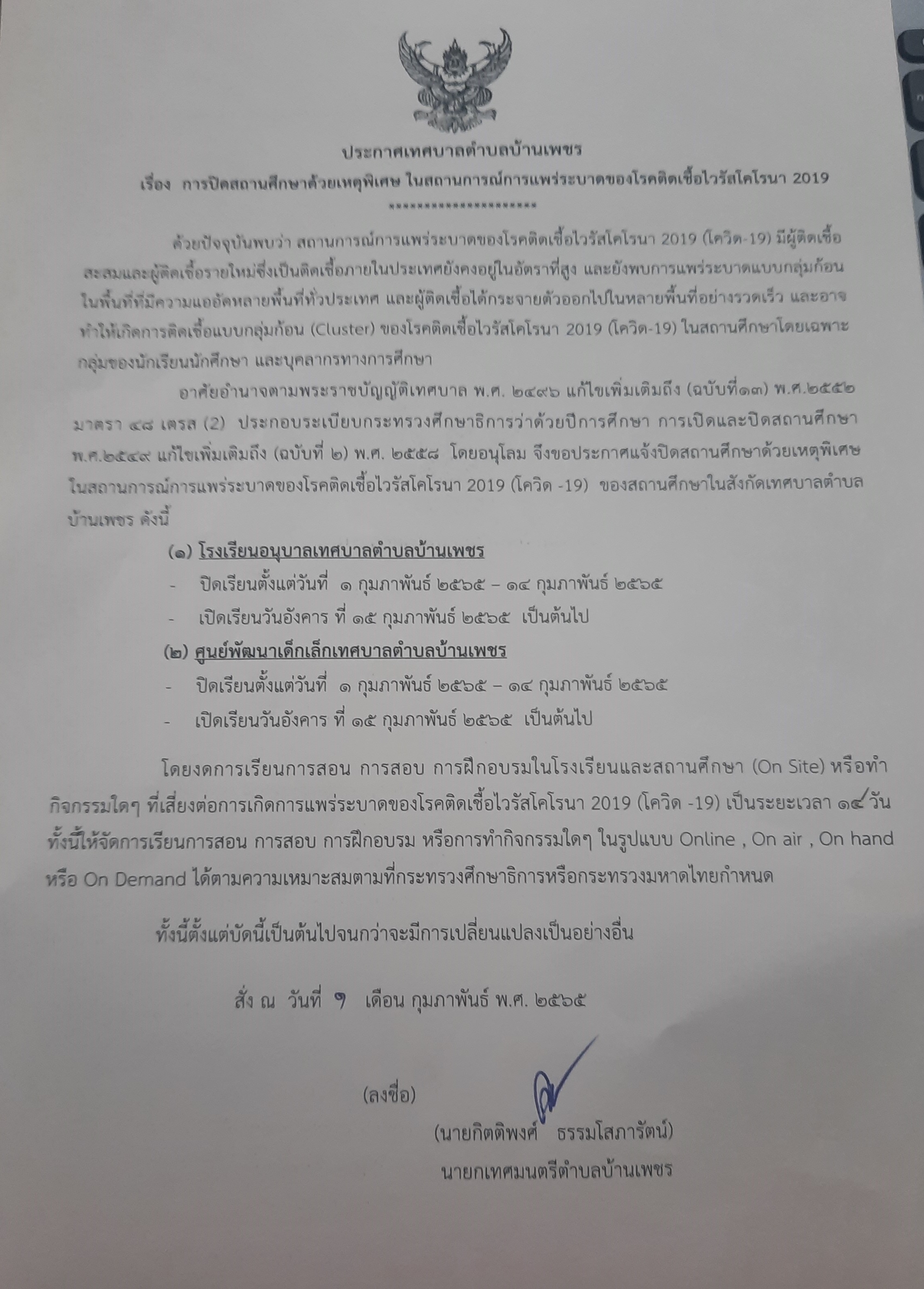 ประกาศเทศบาลตำบลบ้านเพชร เรื่อง การปิดสถานศึกษาด้วยเหตุพิเศษ ในสถานการณ์การแพร่ระบาดของโรคติดเชื้อไวรัชโคโรน่า 2019