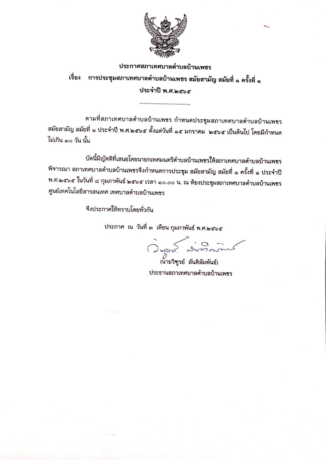 การประชุมสภาเทศบาลตำบลบ้านเพชรสมัยสามัญ สมัยที่ 1 ครั้งที่ 1 ประจำปีพ.ศ.2565