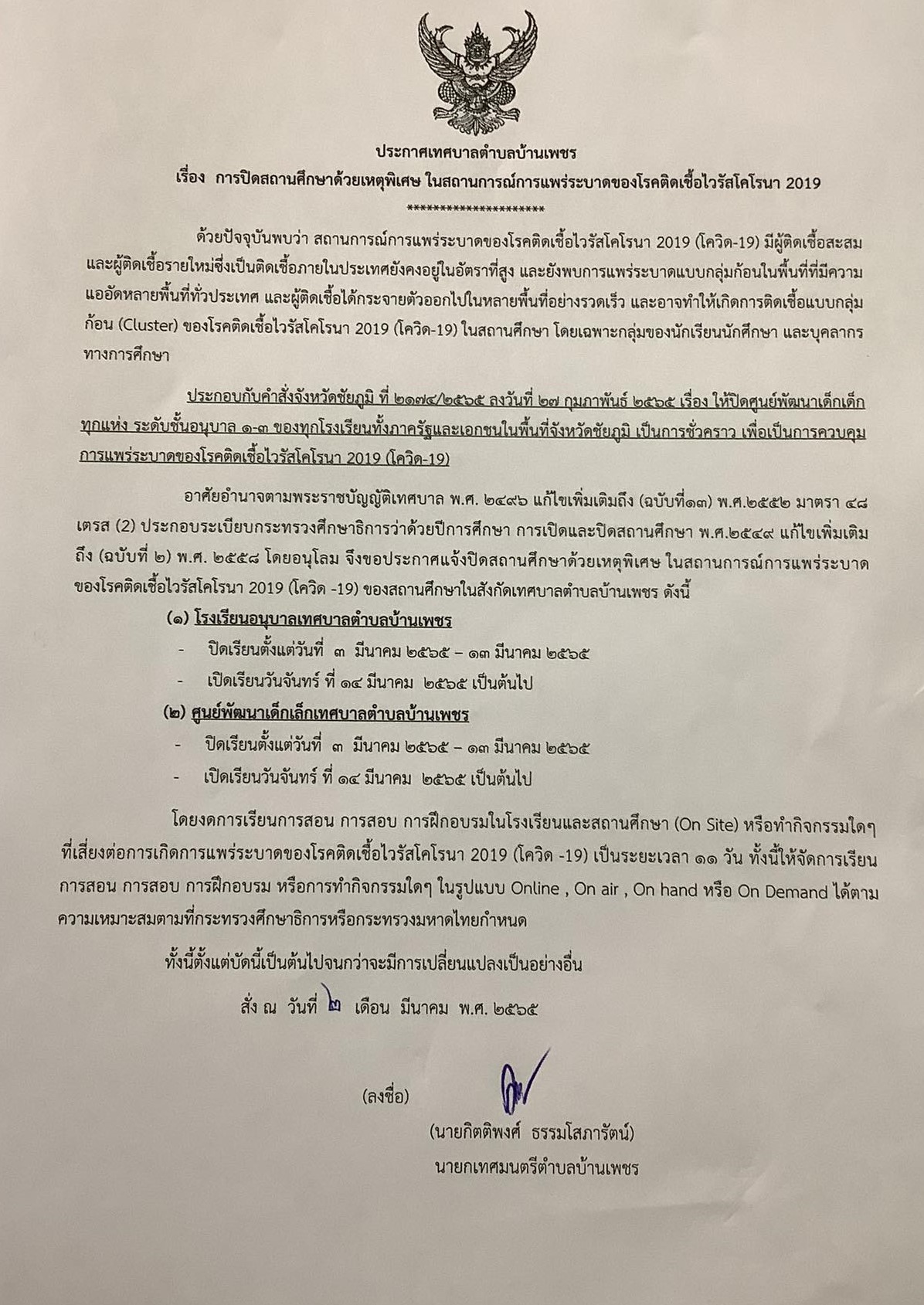 ประกาศเทศบาลตำบลบ้านเพชร เรื่อง การปิดสถานศึกษาด้วยเหตุพิเศษ ในสถานการณ์แพร่ระบาดของโรคติดเชื้อไวรัสโคโรนา 2019