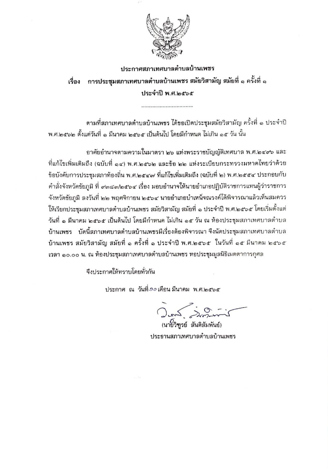 การประชุมสภาเทศบาลตำบลบ้านเพชรสมัยวิสามัญ สมัยที่ 1 ครั้งที่ 1 ประจำปีพ.ศ.2565