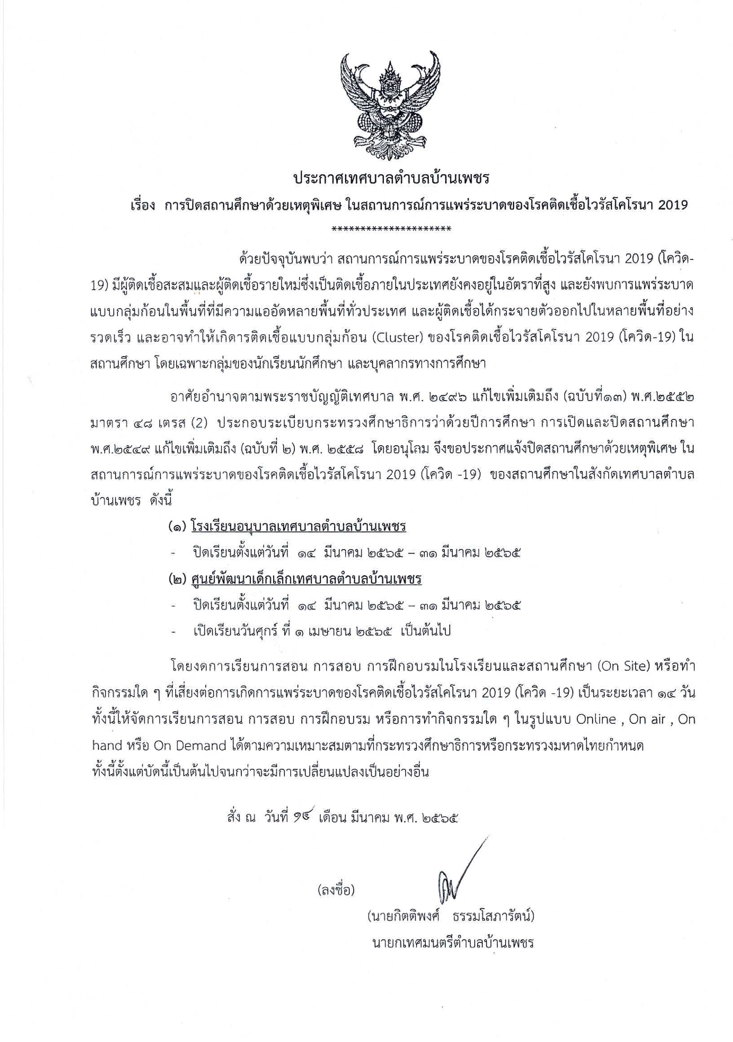 ประกาศเทศบาลตำบลบ้านเพชร เรื่อง การเปิดสถานศึกษาด้วยเหตุพิเศษ ในสถานการณ์แพร่ระบาดของโรคติดเชื้อไวรัสโคโรนา 2019