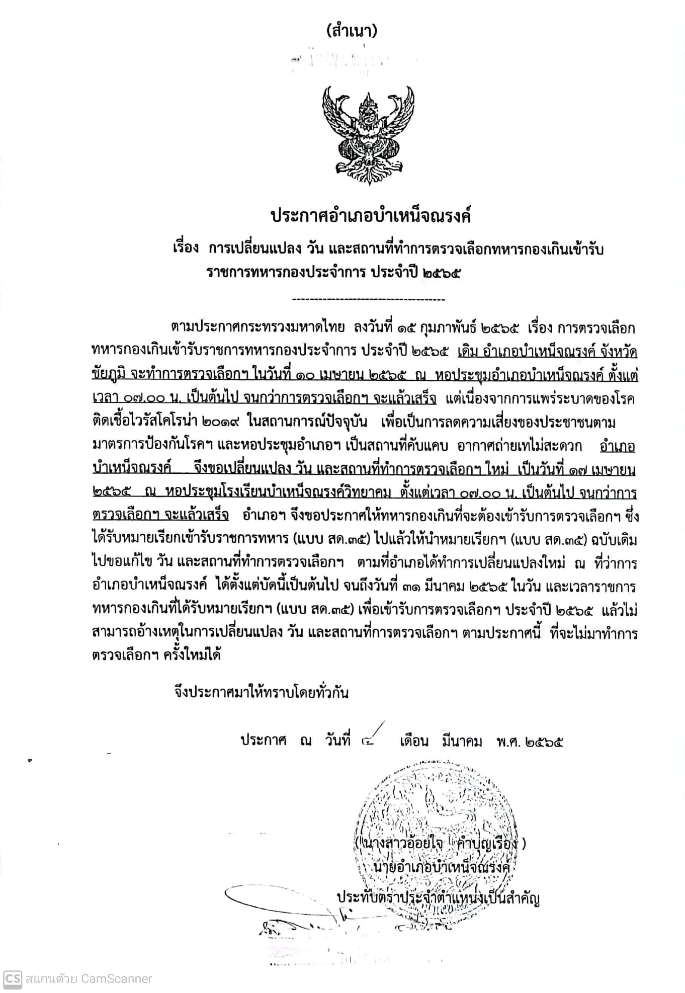 ประกาศอำเภอบำเหน็จณรงค์ เรื่อง การเปลี่ยนแปลง วัน และสถานที่ทำการตรวจเลือกทหารกองเกินเข้ารับราชการทหารกองประจำการ ประจำปี พ.ศ.2565