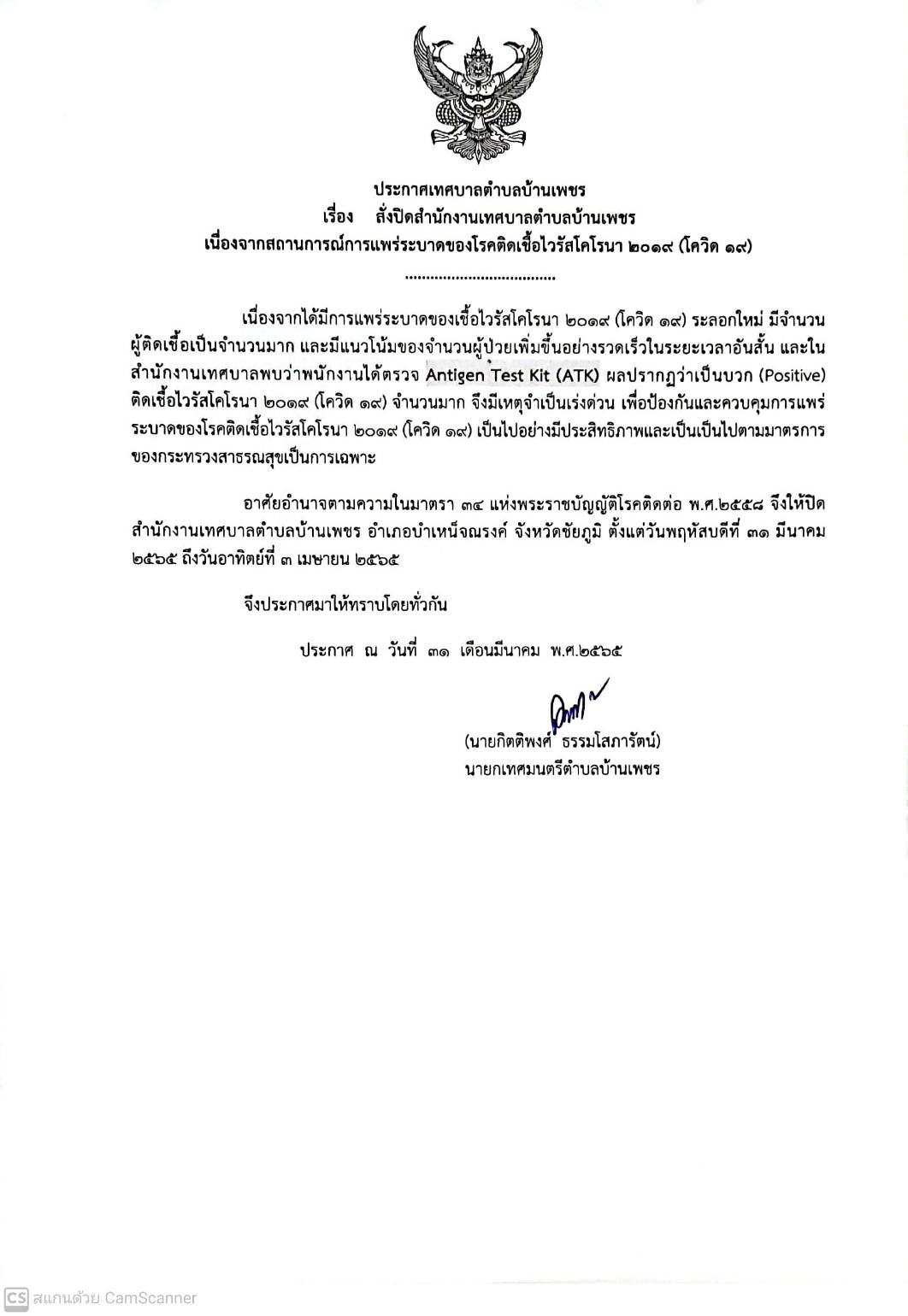 ประกาศเทศบาลตำบลบ้านเพชร เรื่อง สั่งปิดสำนักงานเทศบาลตำบลบ้านเพชร เนื่องจากสถานการณ์การแพร่ระบาดของโรคไวรัสโคโรน่า 2019 (โควิด-19)