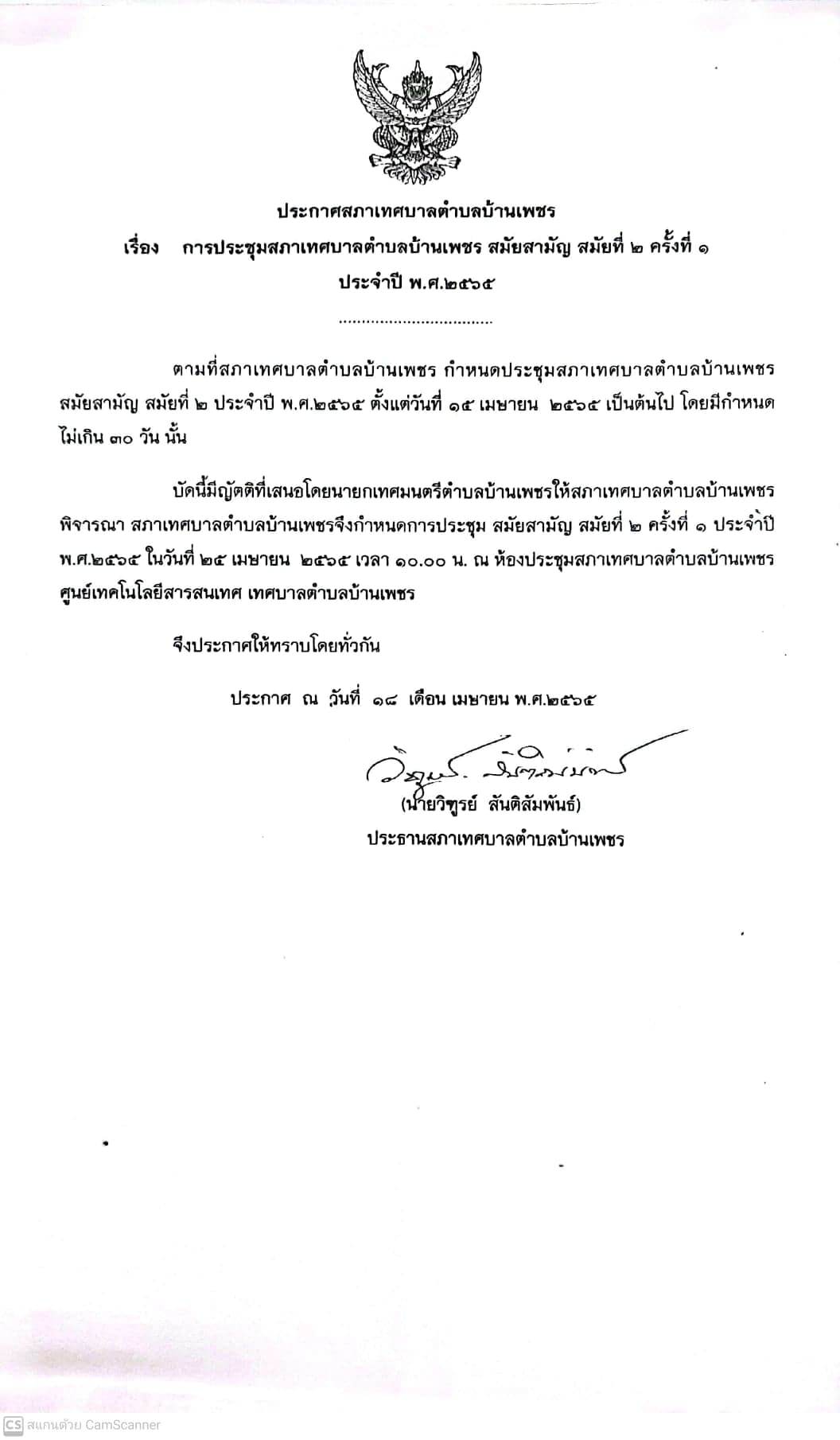 ประกาศเทศบาลตำบลบ้านเพชร เรื่อง การประชุมสภาเทศบาลตำบลบ้านเพชร สมัยสามัญ สมัยที่ 2 ครั้งที่ 1ประจำปี พ.ศ.2565