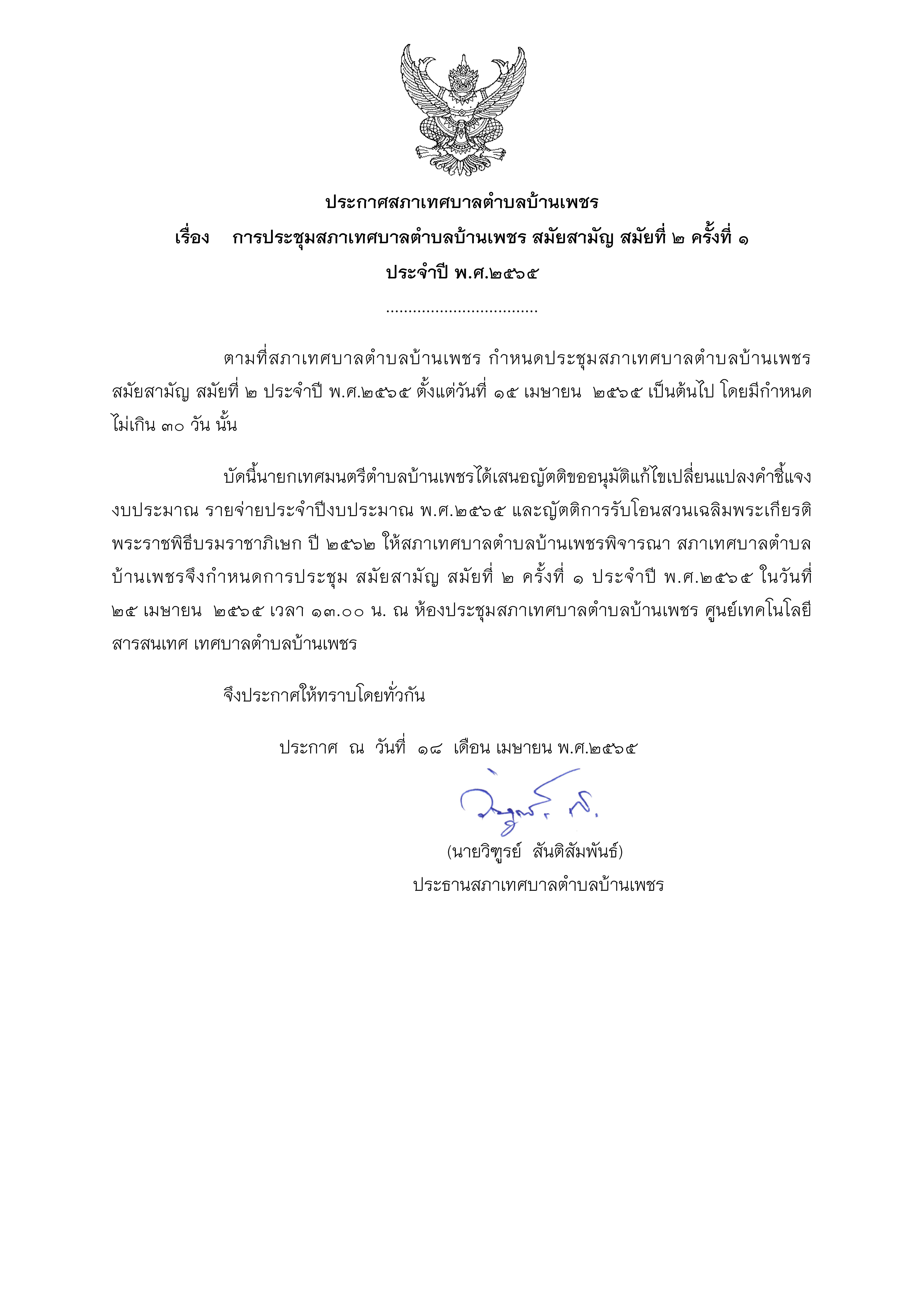 การประชุมสภาเทศบาลตำบลบ้านเพชรสมัยสามัญ สมัยที่ 2 ครั้งที่ 1 ประจำปีพ.ศ.2565