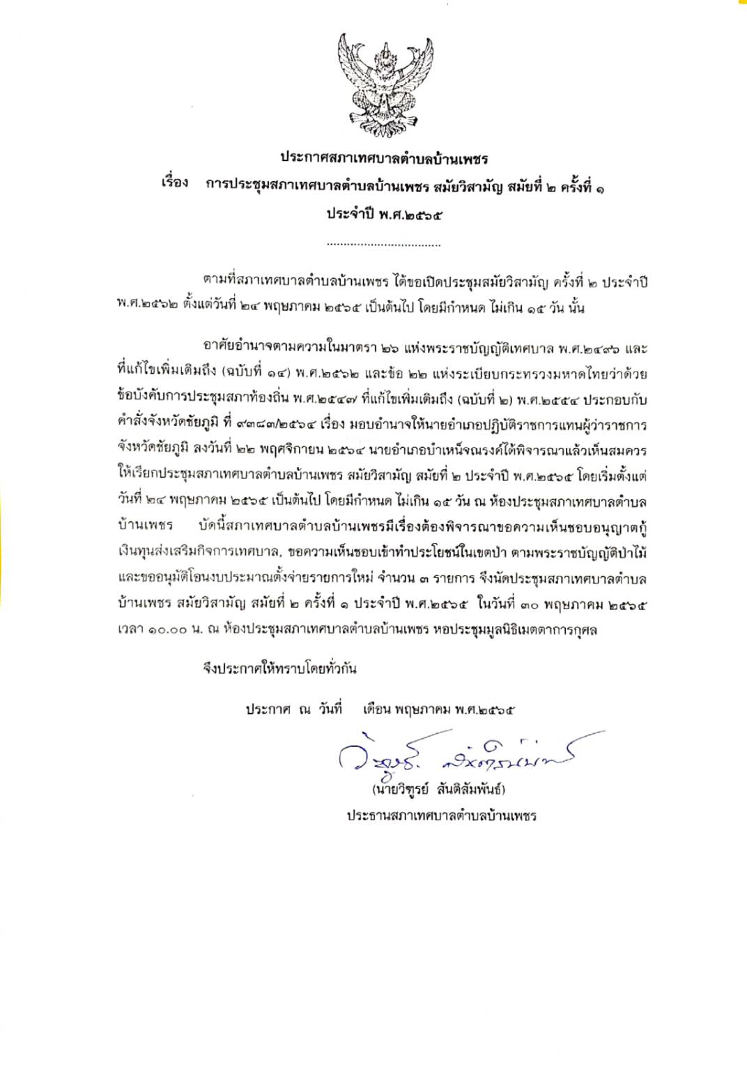 การประชุมสภาเทศบาลตำบลบ้านเพชรสมัยวิสามัญ สมัยที่ 2 ครั้งที่ 1 ประจำปีพ.ศ.2565