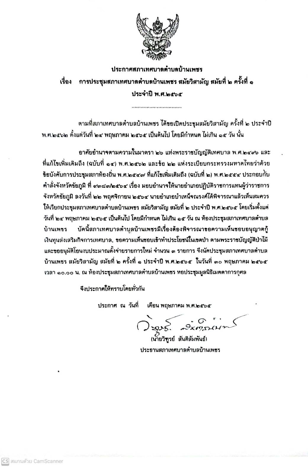 ประกาศเทศบาลตำบลบ้านเพชร เรื่อง การประชุมสภาเทศบาลตำบลบ้านเพชร สมัยวิสามัญ สมัยที่ 2 ครั้งที่ 1 ประจำปี พ.ศ.2565