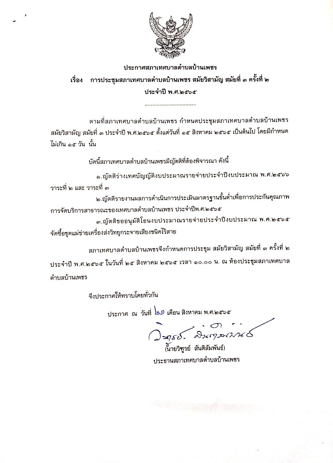 การประชุมสภาเทศบาลตำบลบ้านเพชรสมัยวิสามัญ สมัยที่ 3 ครั้งที่ 2 ประจำปีพ.ศ.2565