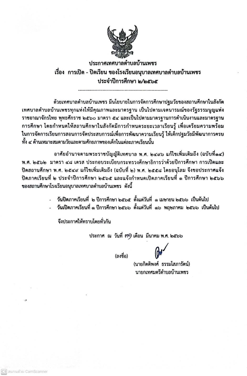 ประกาศ เรื่อง การเปิด - ปิดเรียน ของโรงเรียนอนุบาลเทศบาลตำบลบ้านเพชร ประจำปีการสึกษา 2/2565