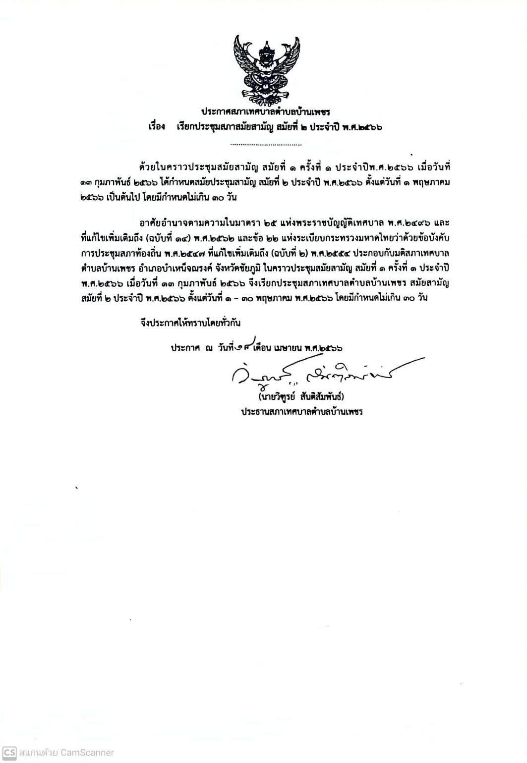 ประกาศ เรื่อง เรียกประชุมสภาเทศบาลตำบลบ้านเพชร สมัยสามัญ สมัยที่ 2 ประจำปี 2566