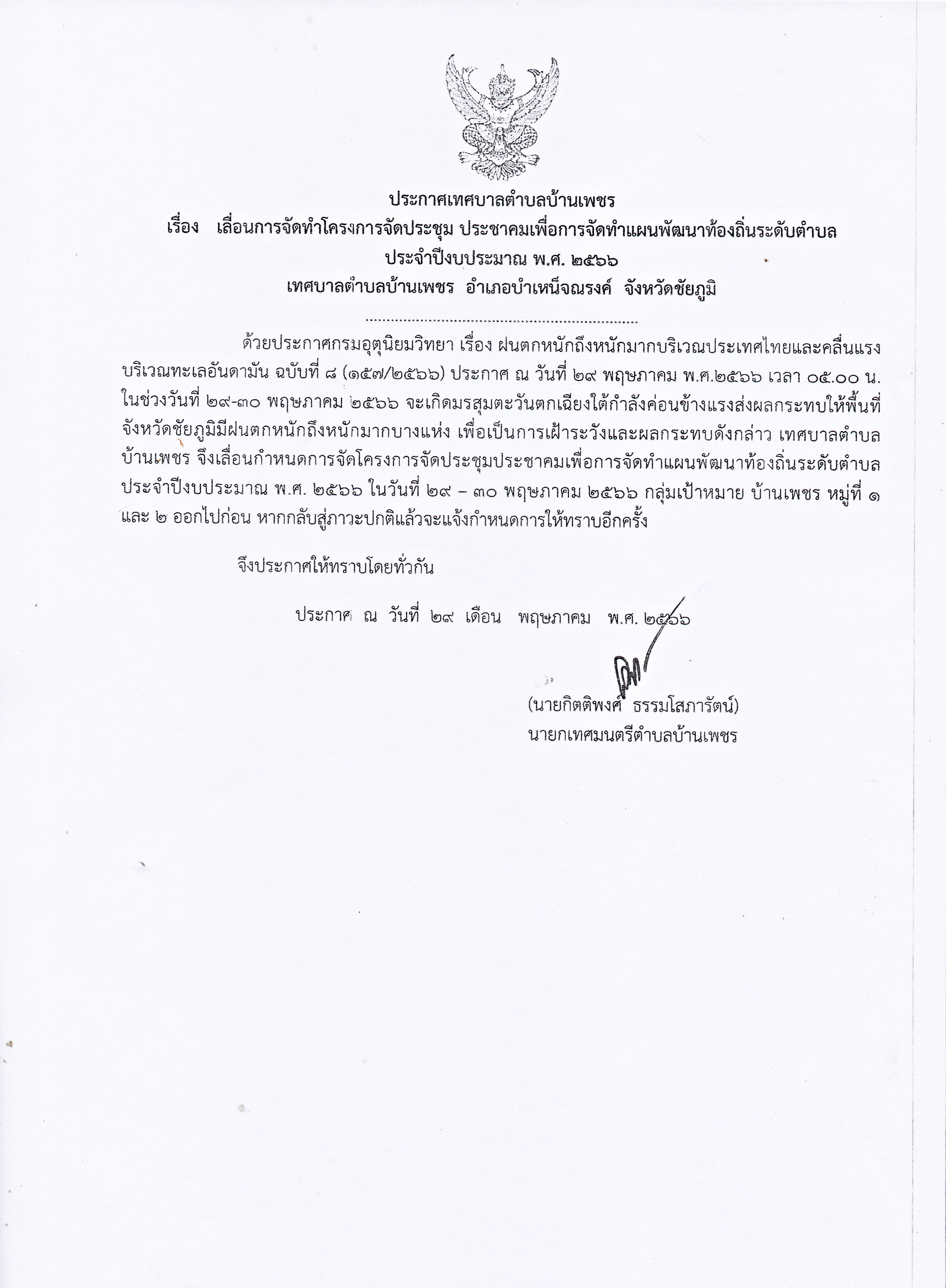 ประกาศ เรื่อง เลื่อนการจัดทำโครงการจัดประชุม ประชาคมเพื่อการจัดทำแผนพัฒนาท้องถิ่นระดับตำบล ประจำปีงบประมาณ พ.ศ. 2566