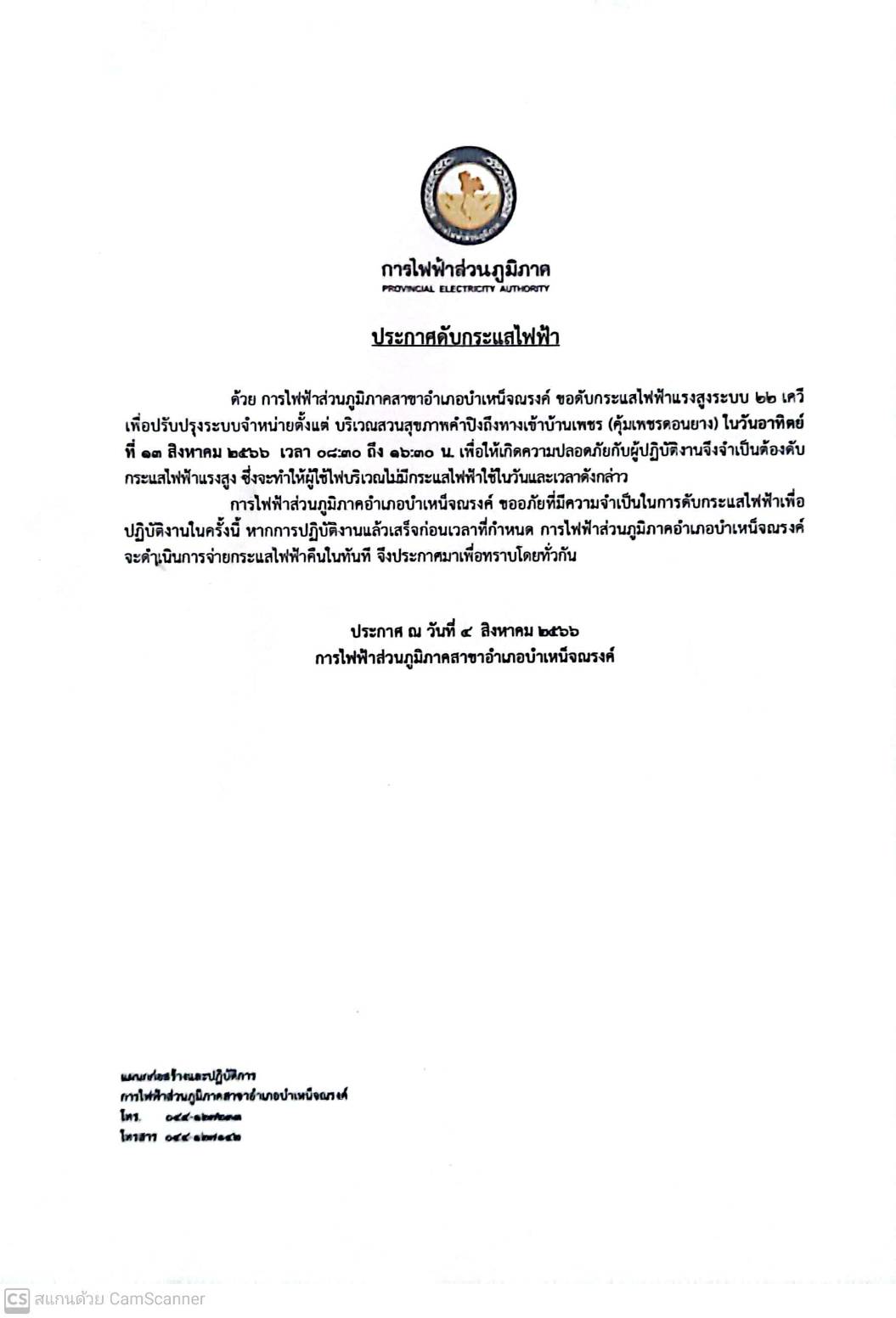 ประกาศดับกระแสไฟฟ้า จากการไฟฟ้าส่วนภูมิภาคสาขาอำเภอบำเหน็จณรงค์
