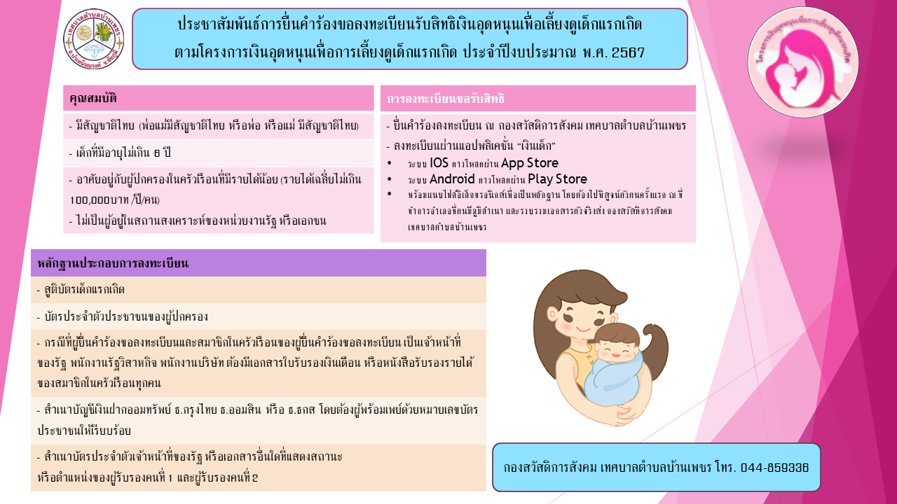 รายละเอียด : ประชาสัมพันธ์การยื่นคำร้องขอลงทะเบียนรับสิทธิเงินอุดหนุนเพื่อเลี้ยงดูเด็กแรกเกิด ตามโครงการเงินอุดหนุนเพื่อการเลี้ยงดูเด็กแรกเกิด ประจำปีงบประมาณ พ.ศ. 2567