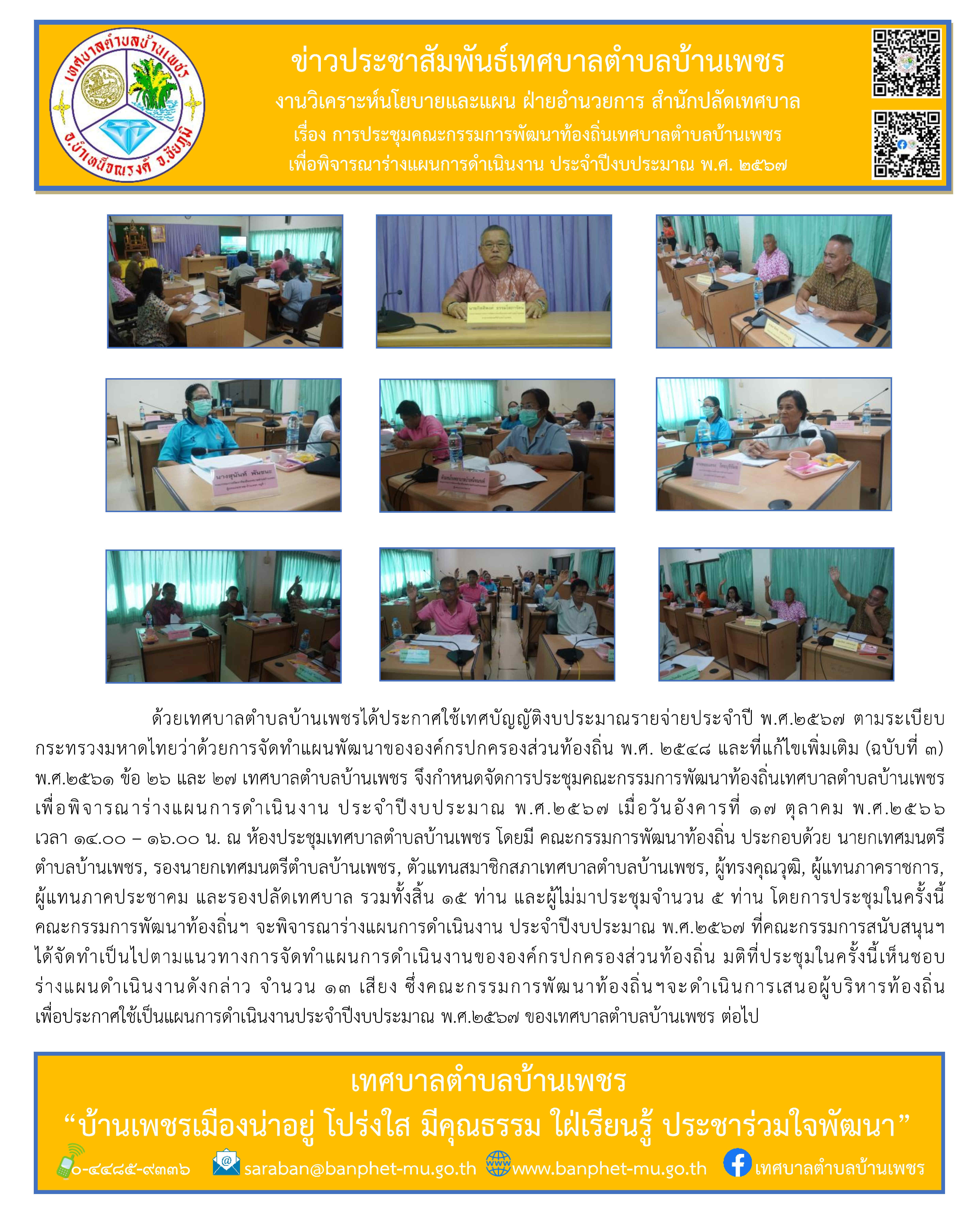 ข่าว-การประชุมคณะกรรมการพัฒนาท้องถิ่นเทศบาลตำบลบ้านเพชร เพื่อพิจารณาร่างแผนการดำเนินงาน ประจำปีงบประมาณ พ.ศ.2567