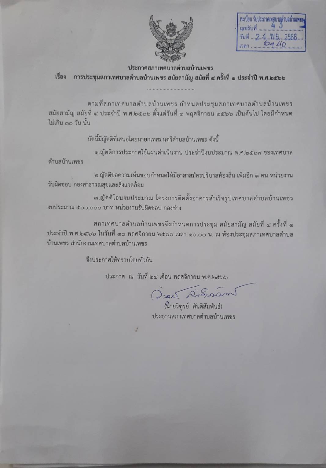 ประกาศ เรื่อง การประชุมสภาเทศบาลตำบลบ้านเพชร สมัยสามัญ สมัยที่ 4 ครั้งที่ 1 ประจำปี 2566