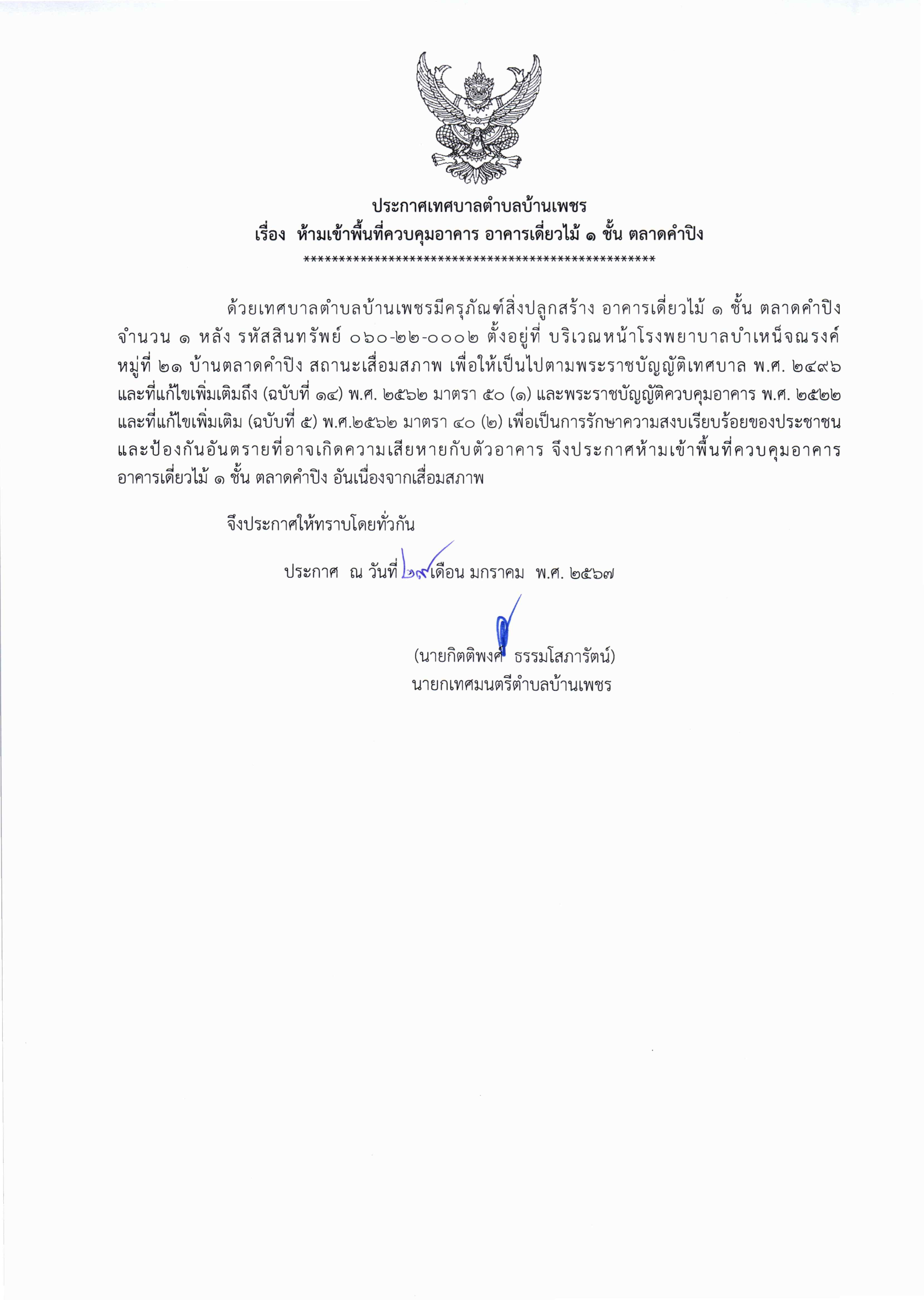 ประกาศ เรื่อง ห้ามเข้าพื้นที่ควบคุมอาคาร อาคารเดี่ยวไม้ 1 ชั้น ตลาดคำปิง