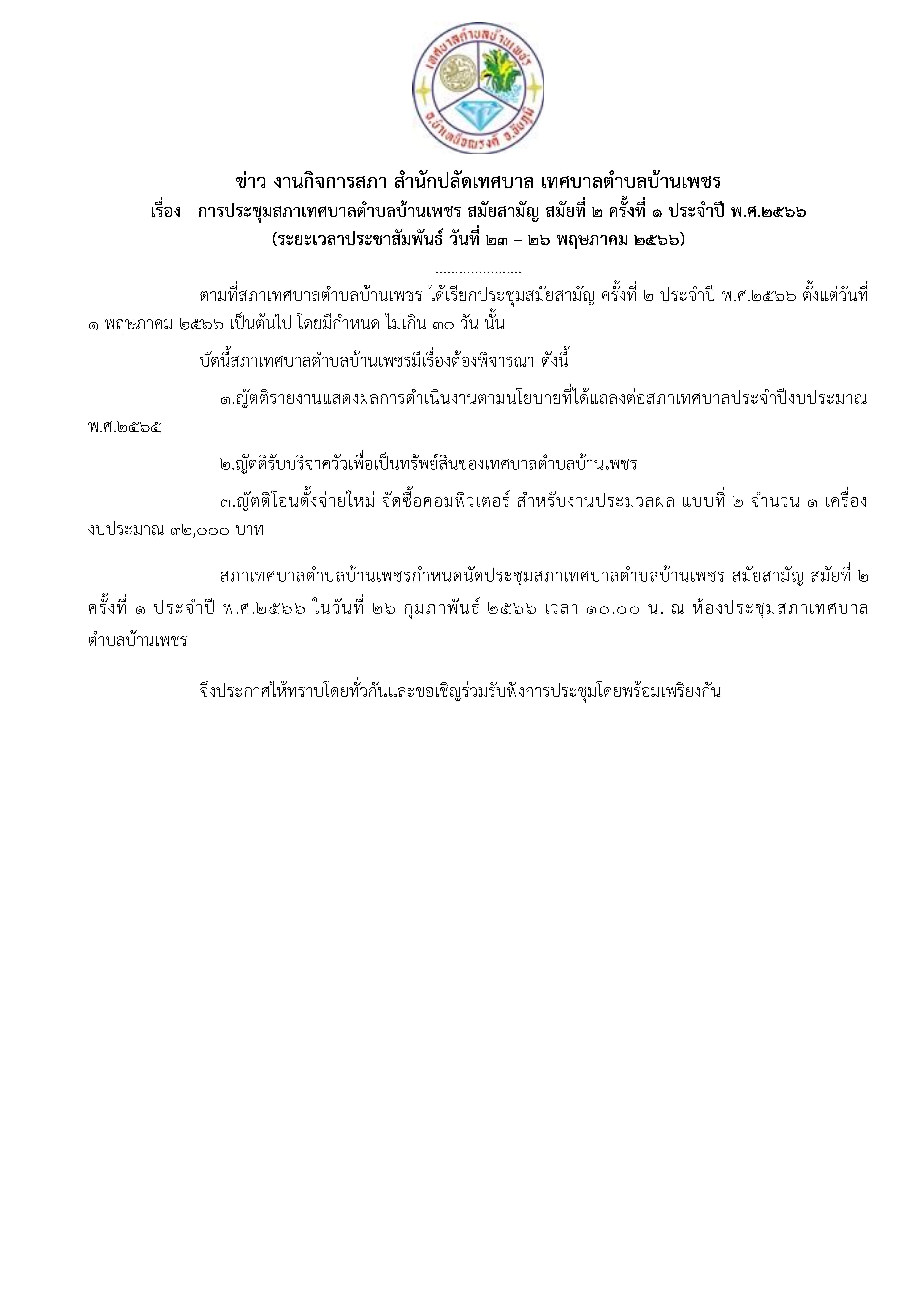 การประชุมสภาเทศบาลตำบลบ้านเพชร สมัยสามัญ สมัยที่ 2 ครั้งที่ 1 ประจำปี พ.ศ.2566