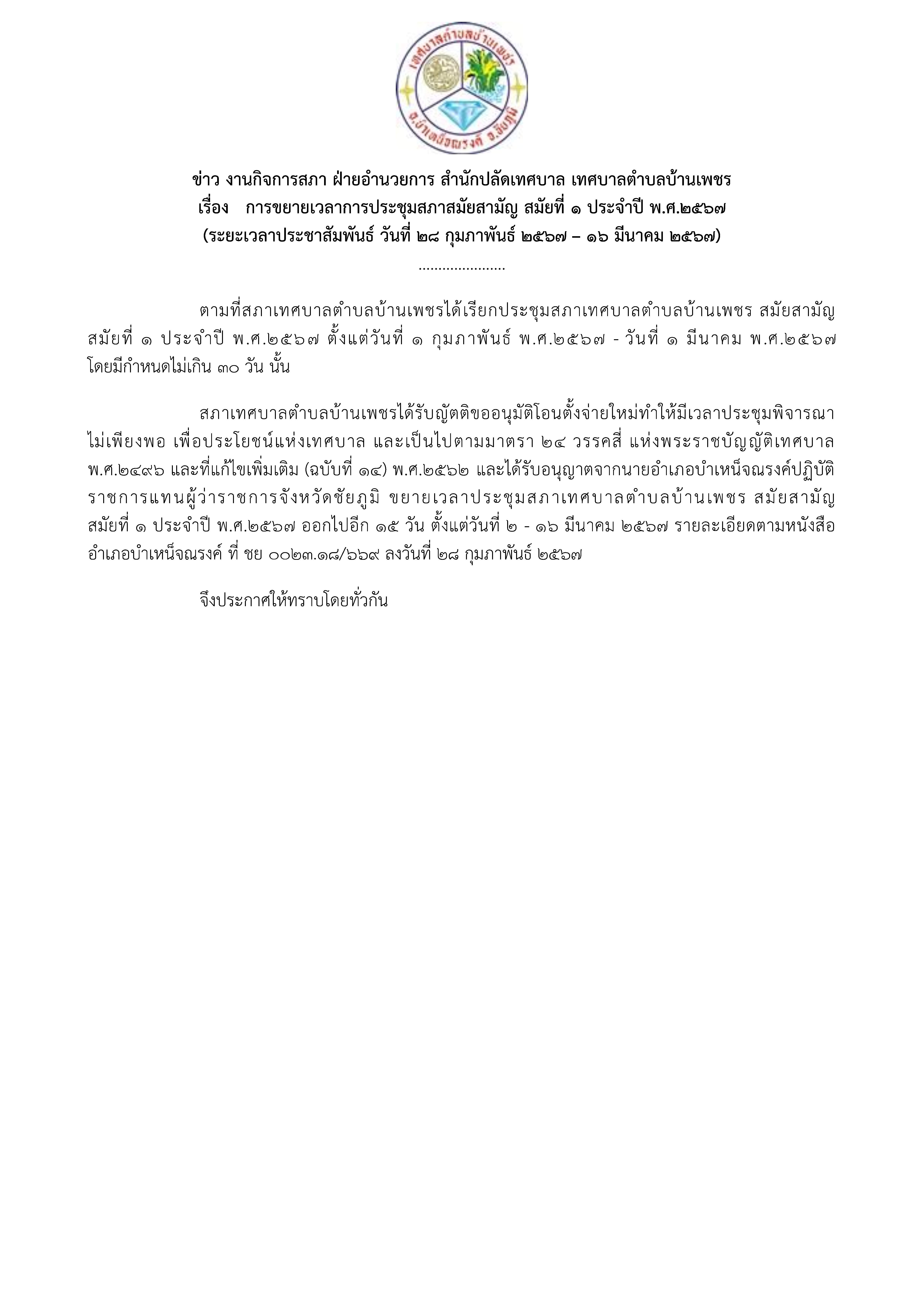 การขยายเวลาการประชุมสภาเทศบาลตำบลบ้านเพชร สมัยสามัญ สมัยที่ 1 ประจำปีพ.ศ.2567