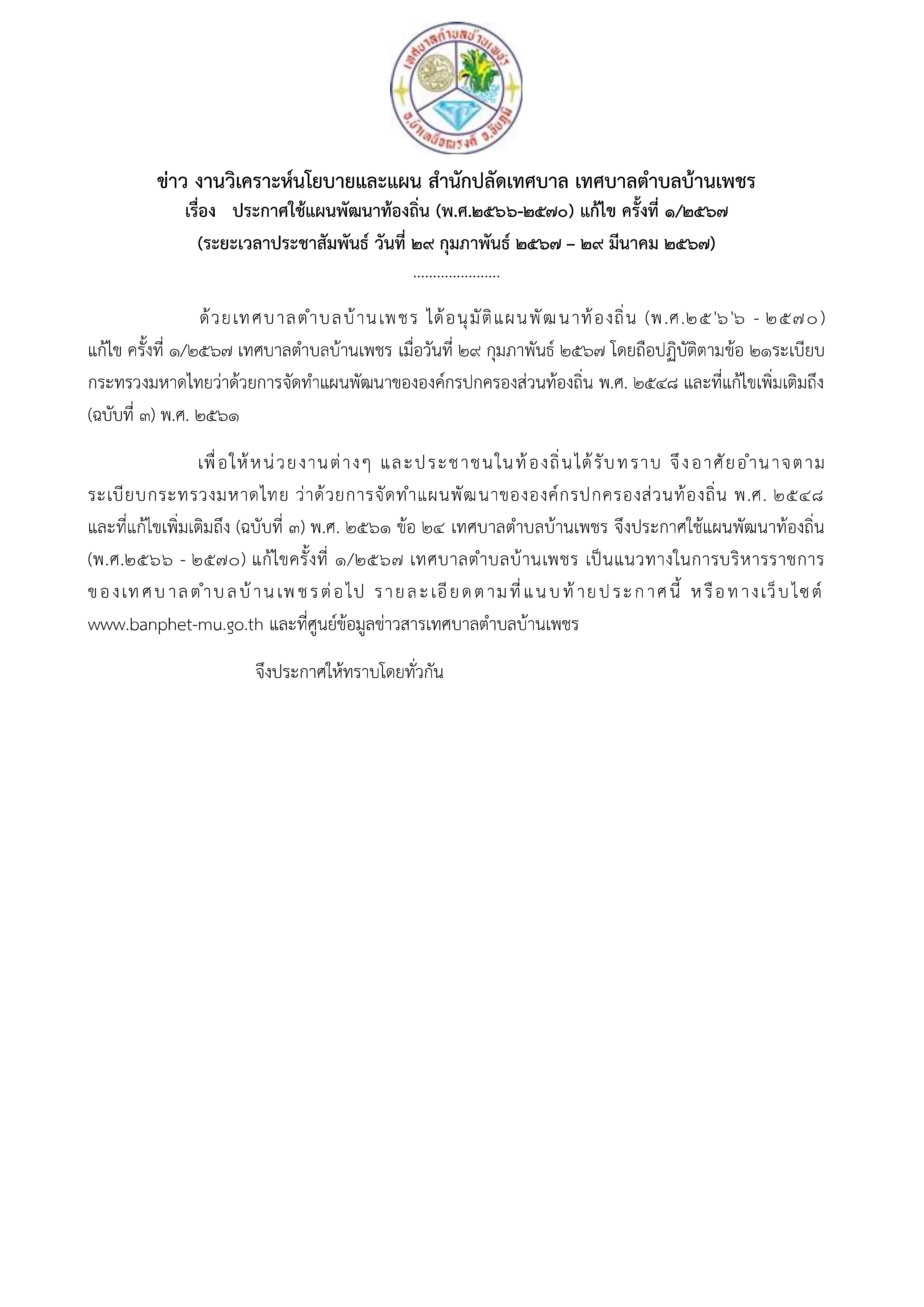 ประกาศใช้แผนพัฒนาท้องถิ่น (พ.ศ.2566-2570) แก้ไข ครั้งที่ 1/2567
