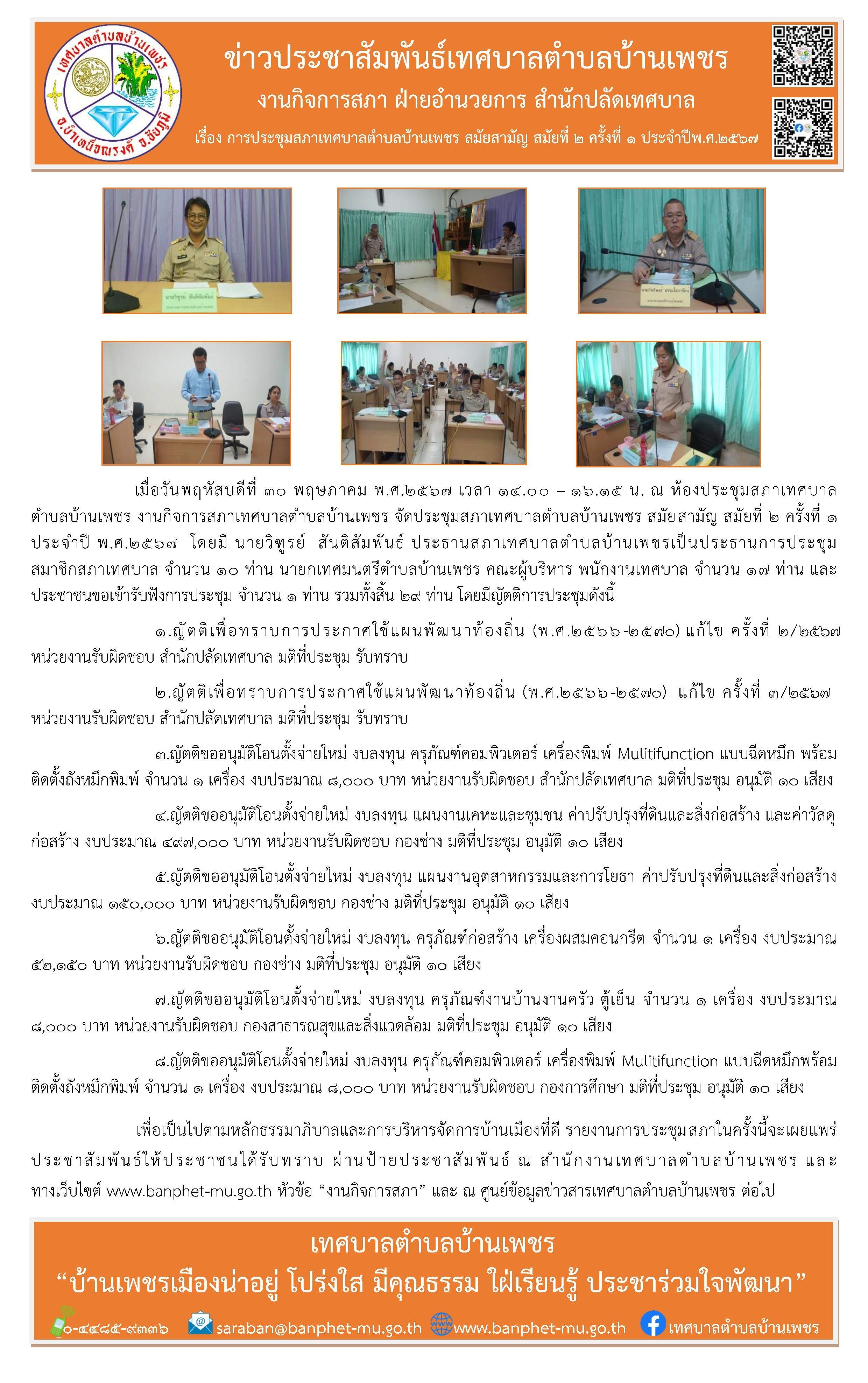 เพื่อเป็นไปตามหลักธรรมาภิบาลและการบริหารจัดการบ้านเมืองที่ดี รายงานการประชุมสภาในครั้งนี้จะเผยแพร่ประชาสัมพันธ์ให้ประชาชนได้รับทราบ ผ่านป้ายประชาสัมพันธ์ ณ สำนักงานเทศบาลตำบลบ้านเพชร และทางเว็บไซต์ www.banphet-mu.go.th หัวข้อ “งานกิจการสภา” และ ณ ศูนย์ข้อมูลข่าวสารเทศบาลตำบลบ้านเพชร ต่อไป