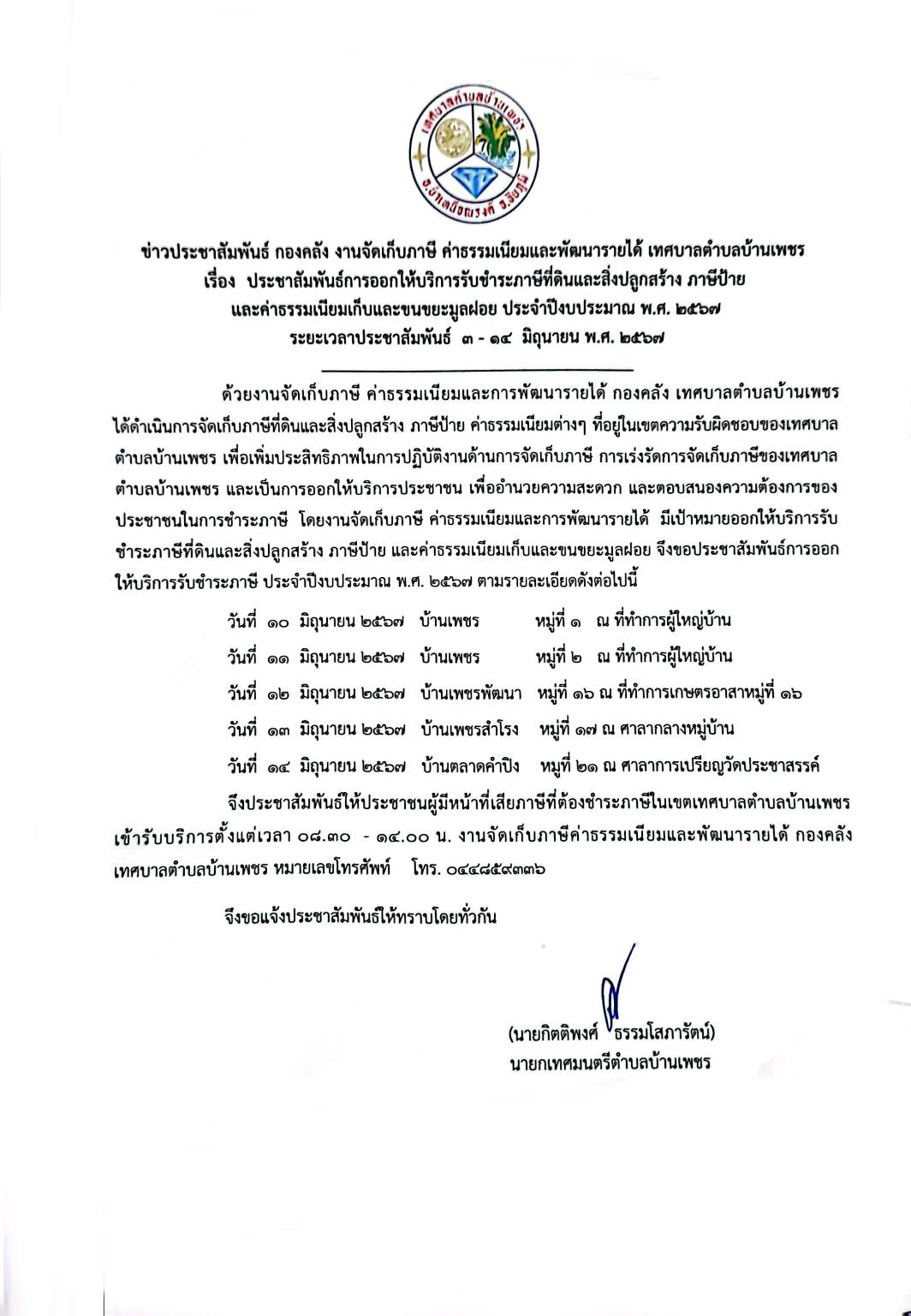 ประชาสัมพันธ์ การออกให้บริการรับชำระค่าภาษที่ดินและสิ่งปลูกสร้าง ภาษาีป้าย และค่าธรรมเนียมเก็บขยะมูลฝอย ประจำปีงบประมาณ 2567