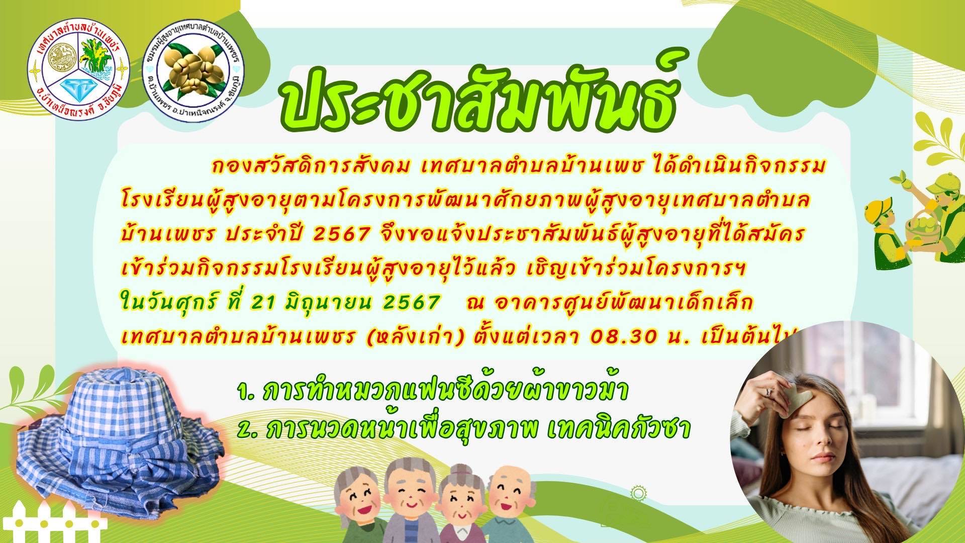 ชื่อเรื่อง : ประชาสัมพันธ์ กิจกรรมโรงเรียนผู้สูงอายุตามโครงการพัฒนาศักยภาพผู้สูงอายุเทศบาลตำบลบ้านเพชร ประจำปี 2567
