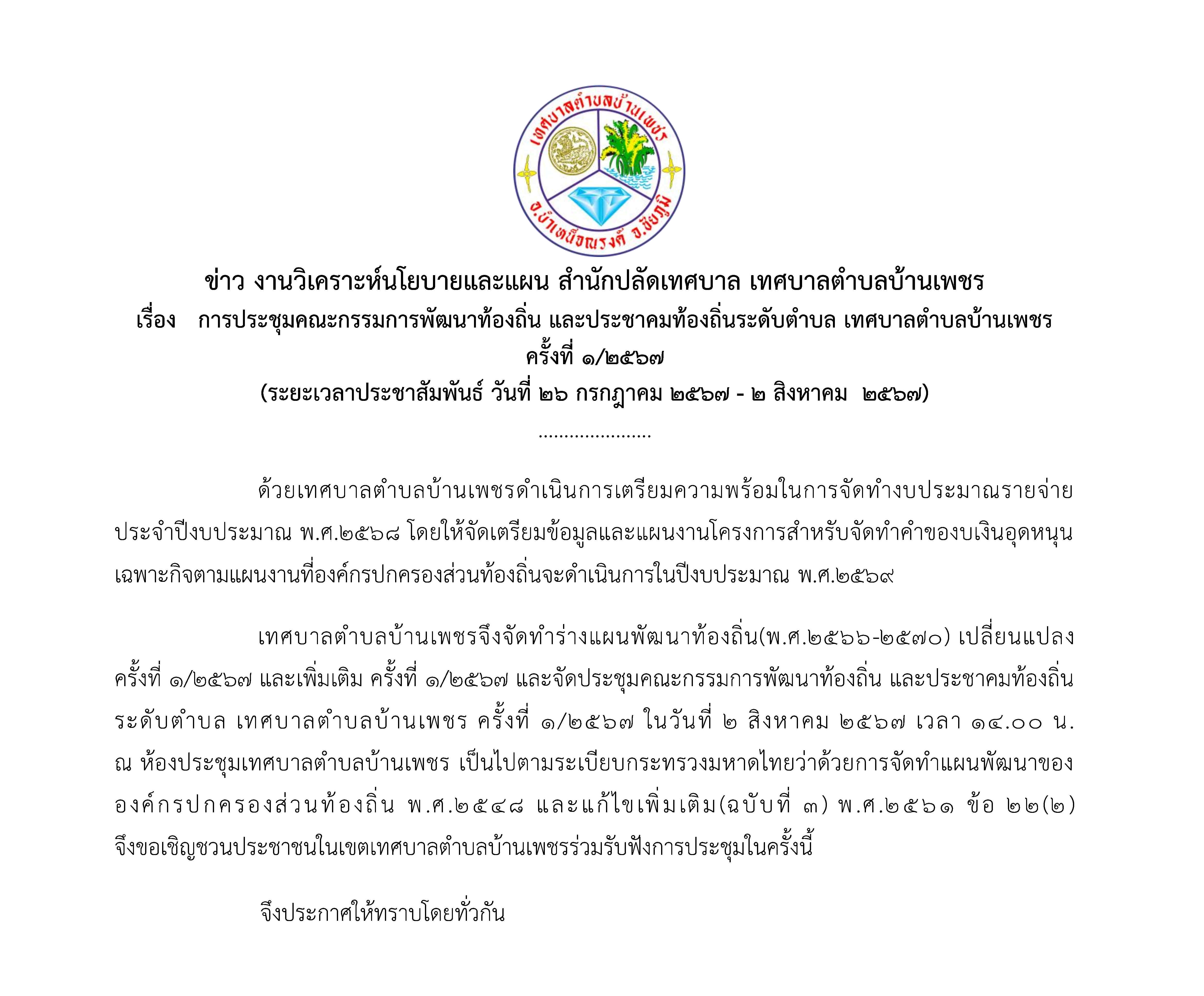 การประชุมคณะกรรมการพัฒนาท้องถิ่น และประชาคมท้องถิ่นระดับตำบล เทศบาลตำบลบ้านเพชร ครั้งที่ 1/2567