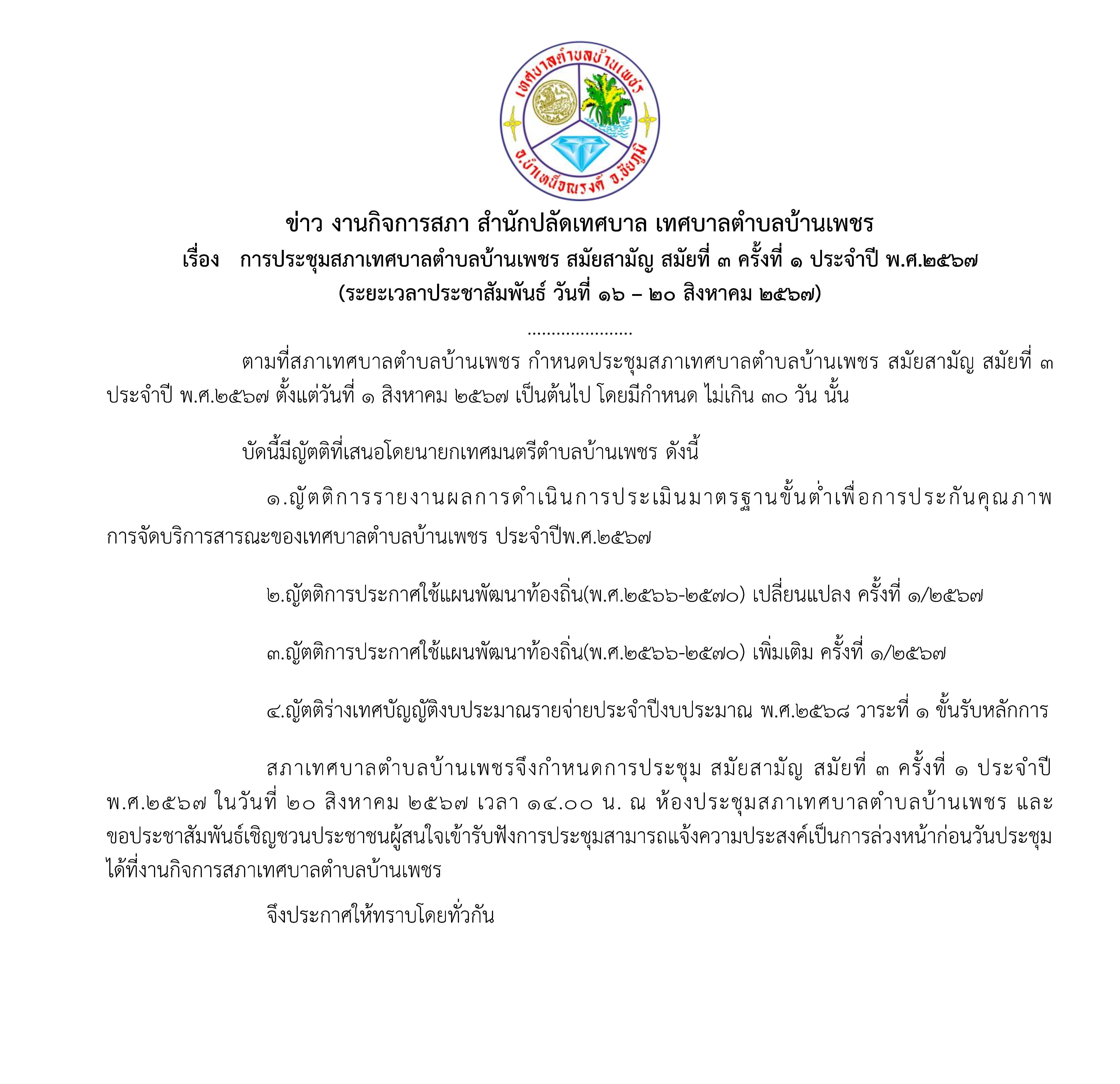 การประชุมสภาเทศบาลตำบลบ้านเพชร สมัยสามัญ สมัยที่ 3 ครั้งที่ 1 ประจำปี พ.ศ.2567