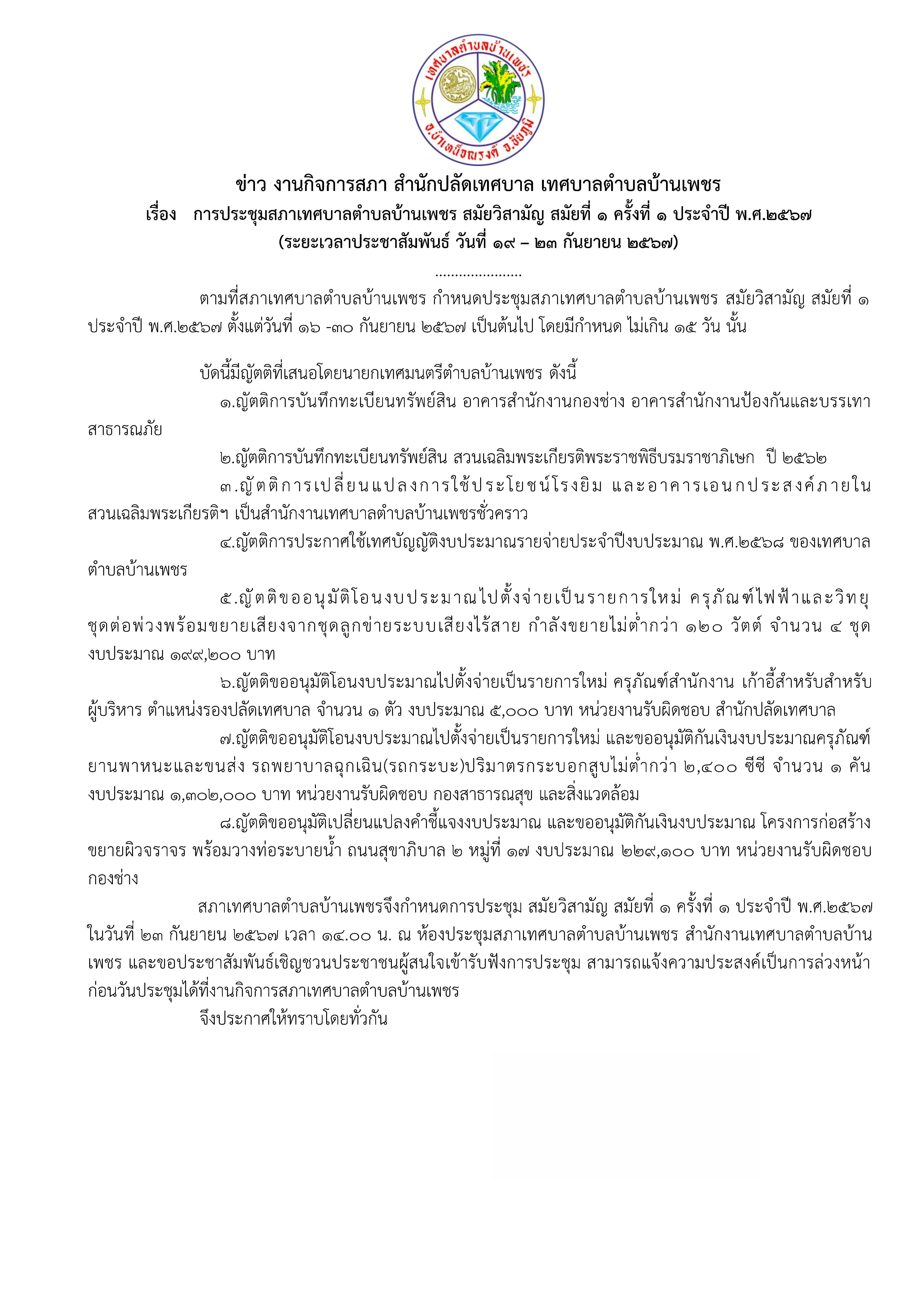การประชุมสภาเทศบาลตำบลบ้านเพชร สมัยวิสามัญ สมัยที่ 1 ครั้งที่ 1 ประจำปี พ.ศ.2567