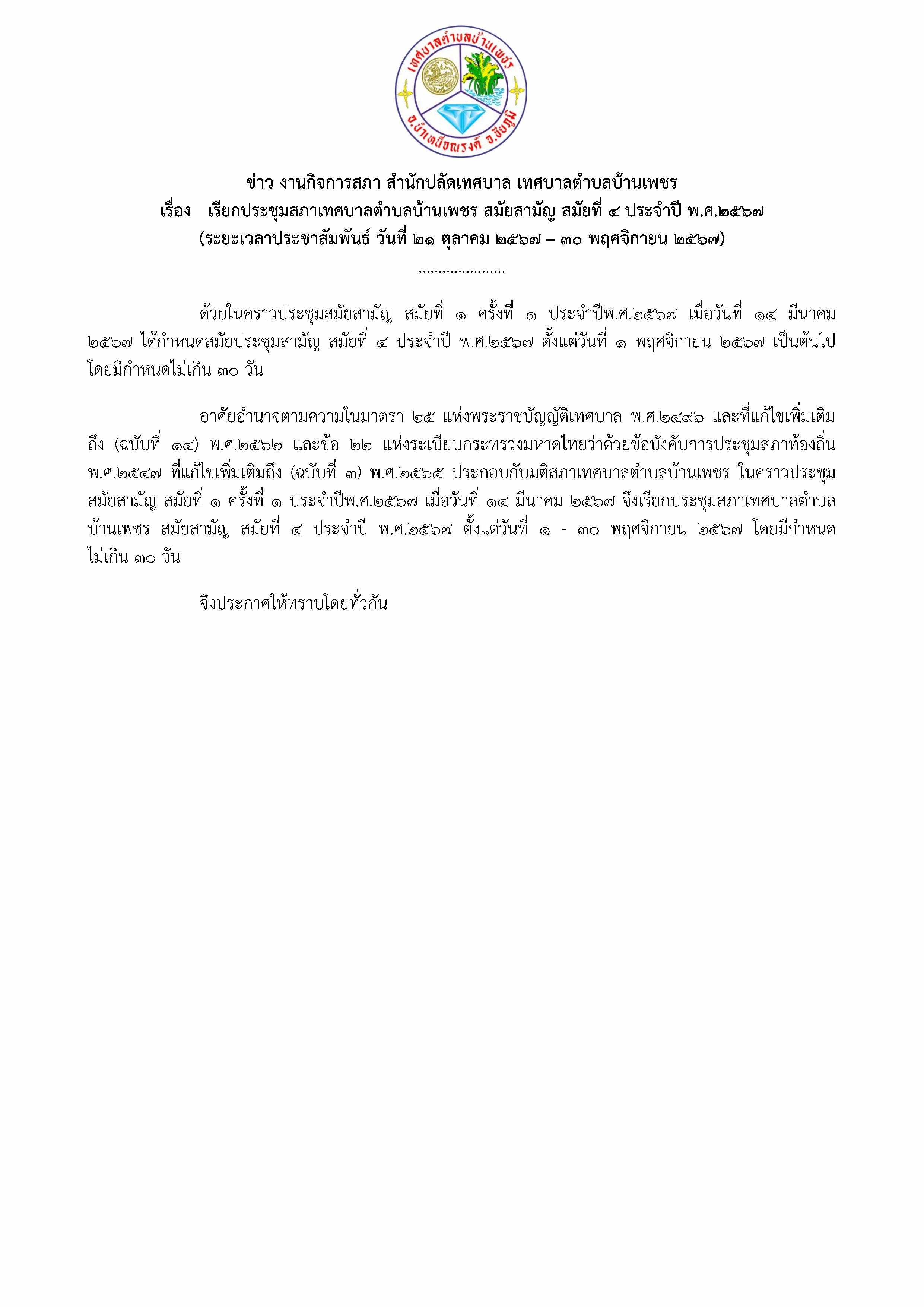 เรียกประชุมสภาเทศบาลตำบลบ้านเพชร สมัยสามัญ สมัยที่ 4 ประจำปีพ.ศ.2567