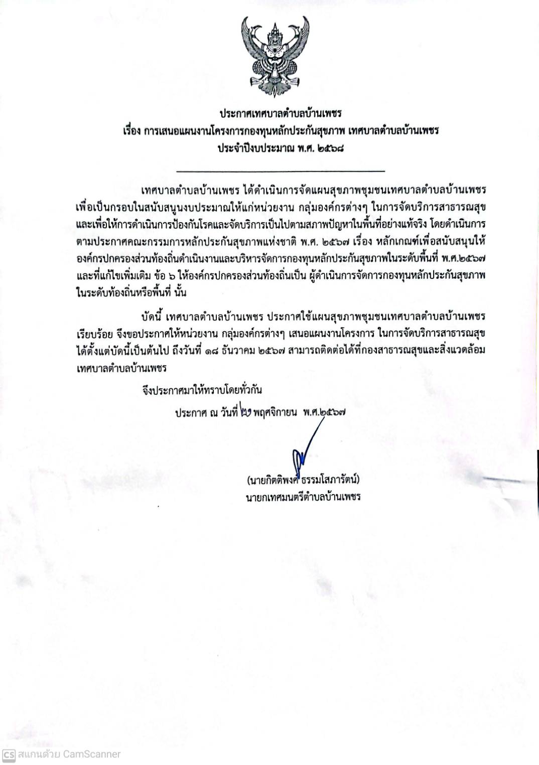 ประกาศ เรื่อง การเสนอแผนโครงการกองทุนหลักประกันสุขภาพ เทสบาลตำบลบ้านเพชร ประจำปีงบประมาณ พ.ศ.2568