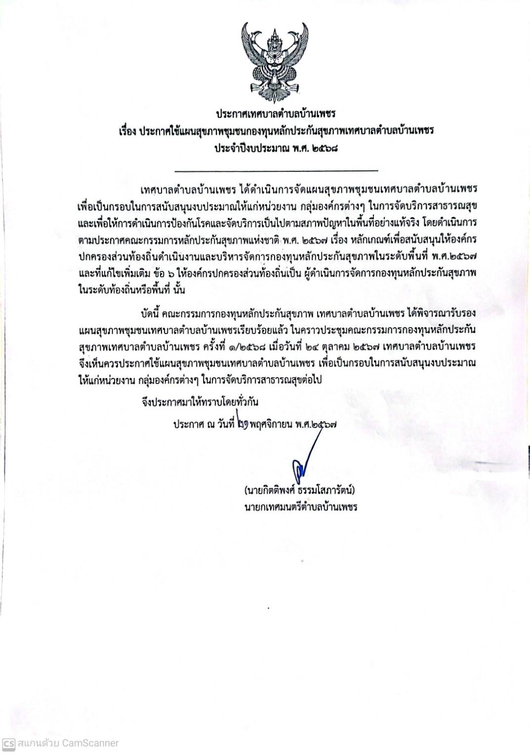 ประกาศ เรื่อง ประกาศใช้แผนสุขภาพชุมชนกองทุนหลักประกันสุขภาพ เทสบาลตำบลบ้านเพชร ประจำปีงบประมาณ พ.ศ.2568