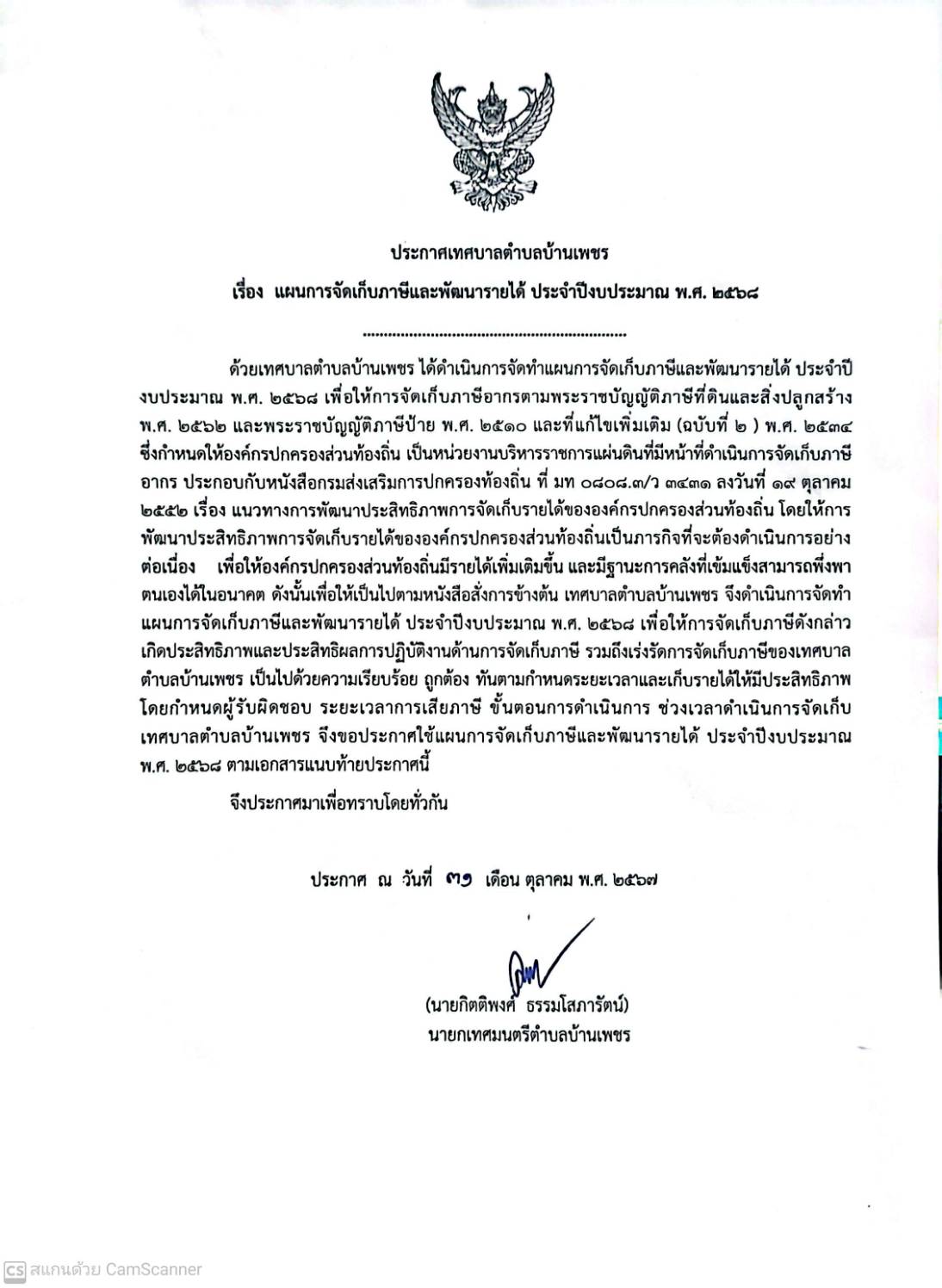 ประกาศ เรื่องแผนการจัดเก็บภาษีและพัมนารายได้ ประจำปีงบประมาณ พ.ศ.2568