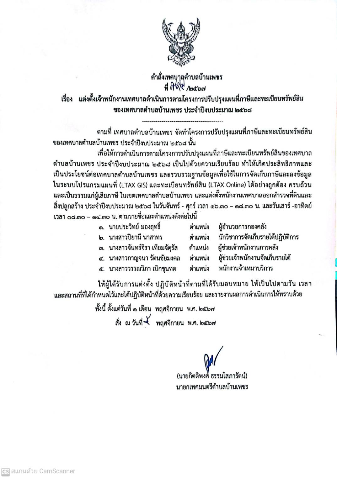 ตำสั่ง เรื่อง แต่งตั้งเจ้าพนักงานเทศบาลดำเนินการตามโครงการปรับปรุงแผนที่ภาษีและทะเบียนทรัพย์สินของเทศบาลตำบลบ้านเพชร ประจำปีงบประมาณ พ.ศ.2568